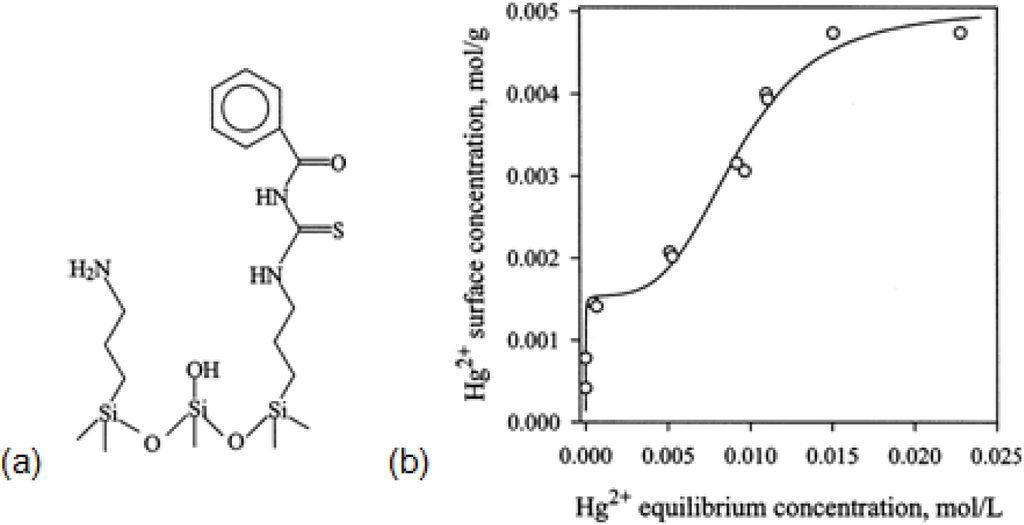 The concentration of 1-benzoyl-3-propylthiourea and (unreacted) aminopropyl groups on the surface of MCM–41 BTU were 1.5 and 0.65 mmol/g, respectively (Figure 13). The adsorption isotherm of Hg2+ on MCM–41 BTU had two regions (Figure 13). In the first region, Hg2+ strongly were adsorbed on 3-aminopropyl residuals (K1 = 1.41 × 105 M−1 and qmax = 1.55 mmol/g) and then in the second region the ions were adsorbed on the 1-benzoyl-3-propylthiourea residuals (K2 = 1.08 × 102 M−1 and qmax = 3.48 mmol/g).