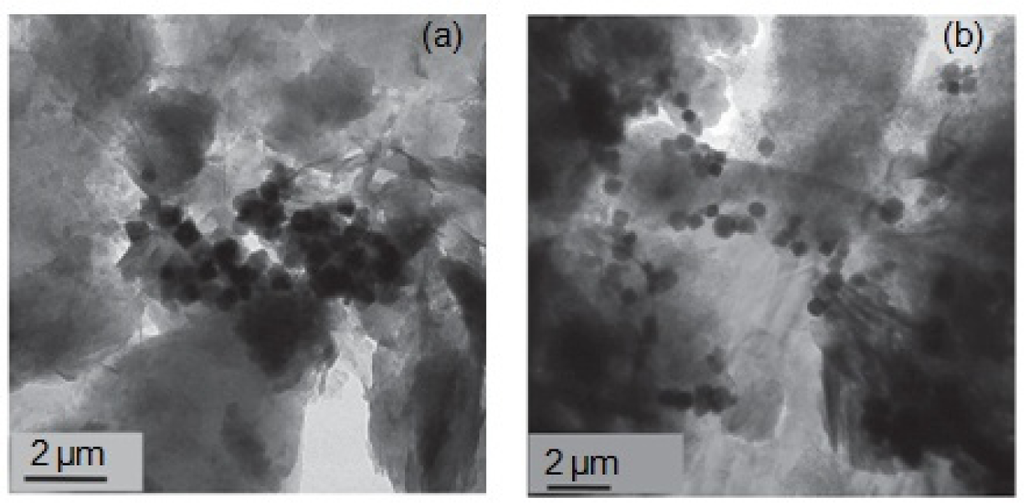 In another groups of organically-functioalized layered compounds, synthetic polymers were used as organic moiety. Fe3O4 nanoparticles coated with polyethylenimine (PEI) polymer were intercalated between sodium rich montmorillonite (MMT) layers [220] under acidic conditions (pH = 2) and used it as a magnetic sorbent for the adsorption of Cr(VI). At pH = 2, amine groups of PEI were protonated and intercalated between MMT platelets by cationic exchange (Scheme 6). Two different molecular weights of PEI were investigated (x = 800 or 25,000 g/mol). The TEM images of Fe3O4–PEIx–MMT compound showed MMT existed as individual exfoliated platelets and intercalation tactoids composed by a few sheets (Figure 15).