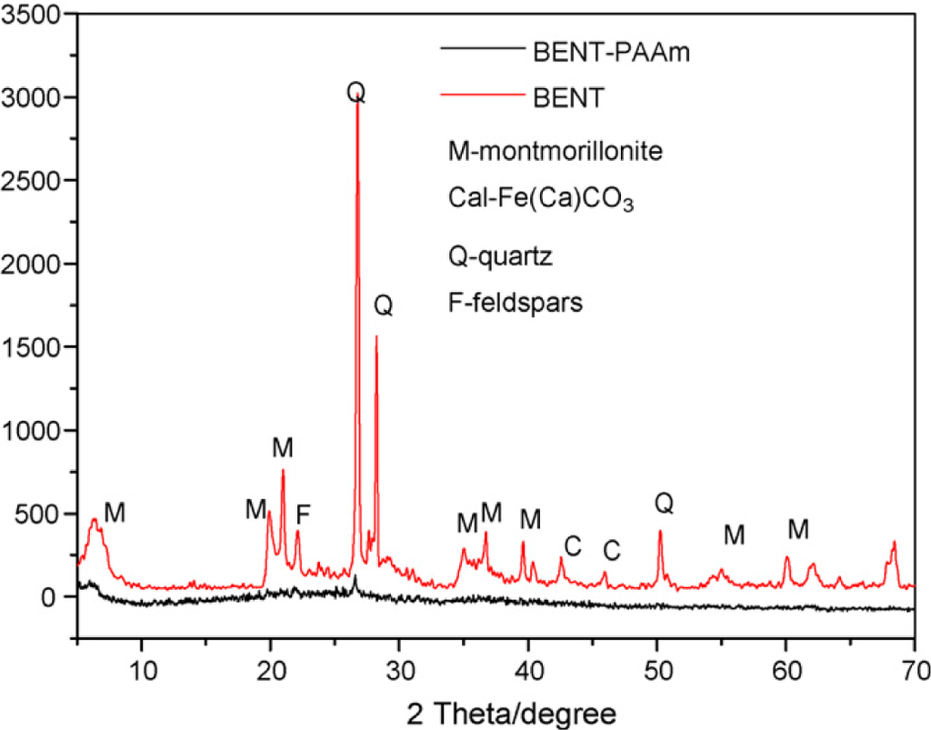 Bentonite (BENT) embedded in polyacrylamide (PAAm) composite was used [223] for the removal of Cu2+ from water. XRD patterns of BENT and BENT–PAAm (Figure 16) shows that acrylamide polymerization destroyed BENT structure and resulted in the crystal confusion. Results showed that the optimum pH for the adsorption of Cu2+ was 6.2. Increasing pH, increased the negatively charged or deprotonated amines and SiOH groups of BENT–PAAm and also increased the hydrolysis of Cu(II).