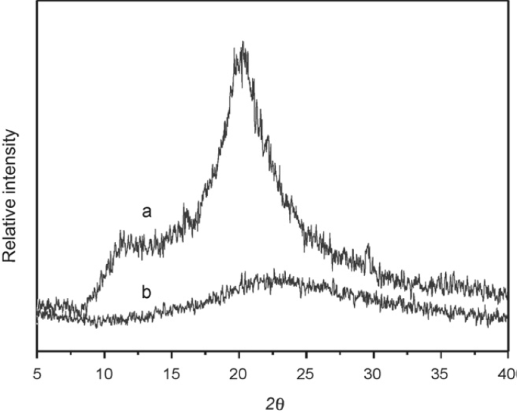 Some authors have used natural carbohydrate and biomass as shell of their adsorbents. Immobilization of biomass (Chetoceros sp microalgae) on a SiO2 core resulted in an adsorbent for adsorption of Pb2+ [238]. Chitosan-grafted silica gel imprinted by sucrose and polyethylene glycol 4000 (PEG 4000) was used for the adsorption of Cu2+ [239]. This method has been used for direct preparation of porous sorbent with low mass transfer resistance, available functional ligand and excellent mechanical resistance [240]. Sucrose and PEG 4000 interacted with chitosan via hydrogen bonds and extraction of them, by breakage of H-bonds, resulted in a porous structure. The optimum pH for the adsorption of Cu2+ on this adsorbent was 6. At this pH, copper was mostly as Cu2+ form and most of amine groups of chitosan (its interacting group) were as –NH2. TG/DSC analyses showed that the thermal stability of grafted chitosan was higher than pure chitosan (Supporting information Figure S9). The XRD patterns show no peak for crystallization regions of chitosan in non-supported hybrid material compared to those of pure chitosan which might be ascribed to the demolition of its crystallinity (Figure 17). The qmax values of Cu2+ adsorption for the adsorbent imprinted with sucrose and PEG 4000, PEG 4000, sucrose and non-imprinted adsorbent [241] were 10.5, 9.1, 3.2 and 0.2 mmol/g, respectively.