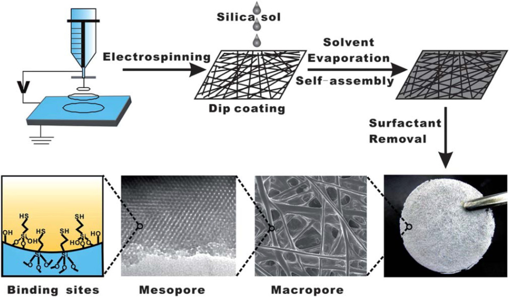 - Teng, M.; Wang, H.; Li, F.; Zhang, B. Thioether-functionalized mesoporous fiber membranes: Sol-gel combined electrospun fabrication and their applications for Hg2+ removal. J. Colloid Interface Sci 2011, 355, 23–28. [Google Scholar]
