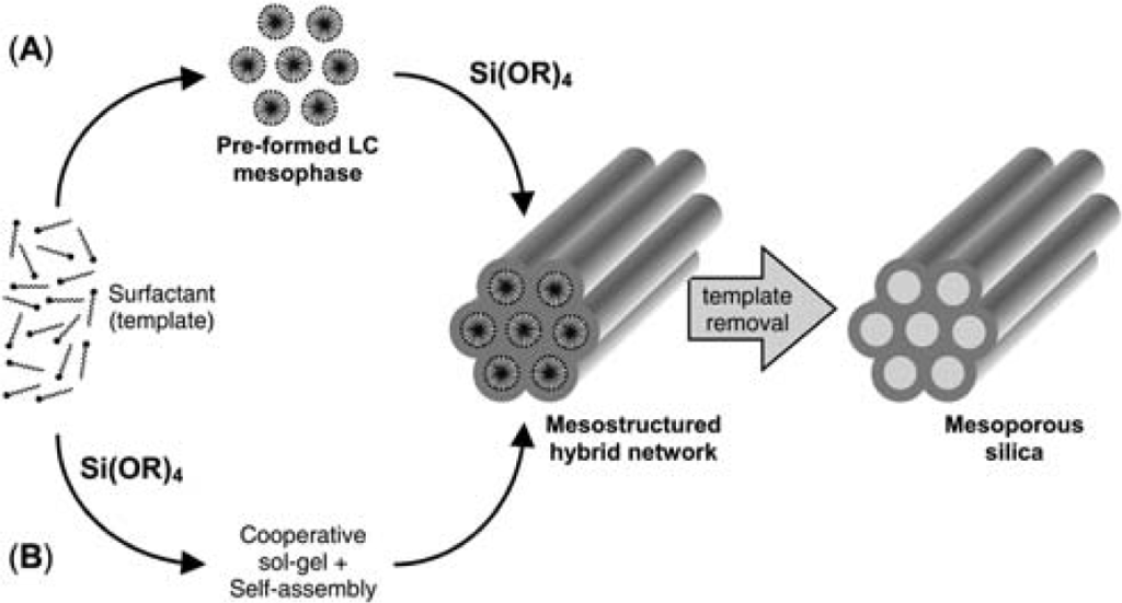 In recent years, attempts of scientists resulted in syntheses of non-silica mesoporous metal oxides such as TiO2, ZrO2, Al2O3, Nb2O5, SnO2, mixed oxides such as SiAlO3.5, SiTiO4, carbon nanocage, mesoporous carbon nitride, etc. [90]. The formation of mesoporous materials is depicted schematically in Figure 2, based on “liquid crystal templating” mechanism [91]. Through route (a) at surfactant concentrations above its critical micelle concentration (CMC), the self-assembly of precursor molecules on the space between micellar rods of lyotropic liquid crystal phase and creates walls between them. Through route (b) at surfactant concentrations below CMC, the mesostructure is formed as a cooperative self-assembly of the precursor and surfactant molecules [82,91].