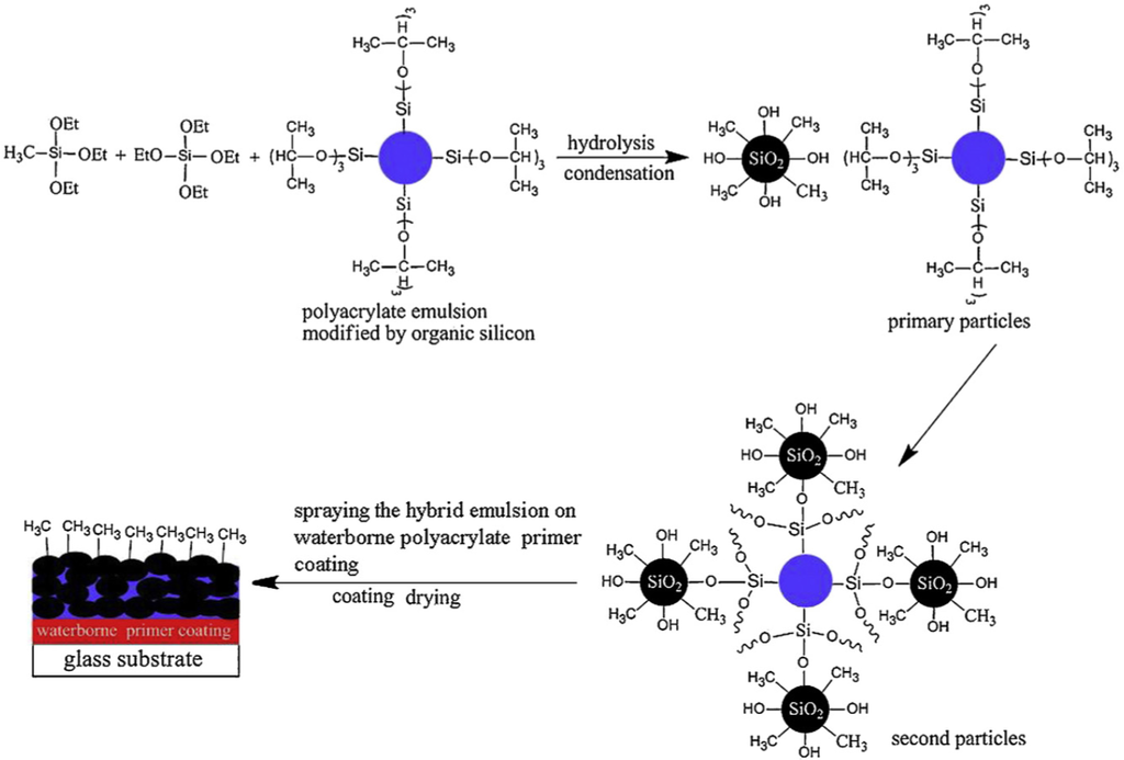 In 1846, Ebelmanl and Graham reported that the hydrolysis of tetraethylorthosilicate (TEOS), under acidic conditions produced SiO2 in the form of fibres [61,62]. In 1950s, Brady et al. [63] produced a number of phenylsilsesquioxane-alkylsilsesquioxane copolymers that were the first successful commercial organic-inorganic hybrid polymers. The sol-gel process is a cheap and low-temperature method for producing transparent and homogenous solid materials with high purity from small molecules and for controlling the chemical composition of products. Compounds produced by the sol-gel process have many applications in superhydrophobic surfaces [41] (shown in Scheme 1), electrolyte [48], biosensors [54], corrosion protection [56], etc.
