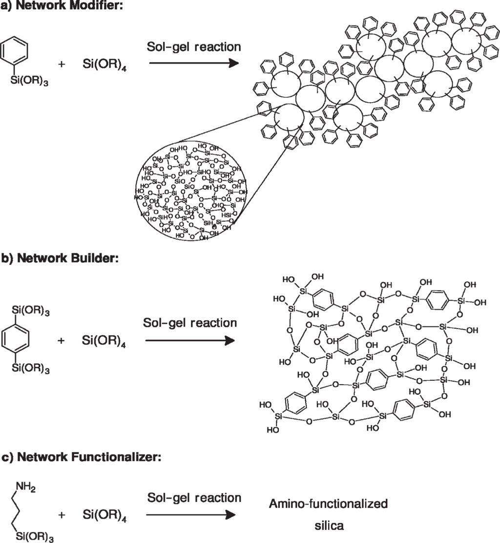 A suitable way for modifications of properties of materials obtained from this method is the introduction of organic groups (R) into their structure [71]. For example, the Si–C bond does not hydrolyze in most sol-gel processes and organic groups can be incorporated covalently into the network of inorganic gel using silsesquioxanes [(R–SiO1.5)n (n = even number)], such as R′(OR)2Si–R–Si(OR)3 compounds or derivatives of tetrafunctional silicon alkoxide [organically modified silicates (ORMOSILs)], such as TEOS, R′Si(OR)3, etc. [71]. If an organic group remains stable and does not hydrolyze during sol-gel processes (e.g., alkyl groups) it is defined as a network modifier. On the other hand, if it can react with another monomers or with itself (e.g., –CH=CH2) it is named as a network builder. Moreover, if it is a reactive functional group, such as –NH2, it is specified as a network functionalizer [72] (Scheme 3). These materials belong to class II interactions of organic-inorganic hybrid polymers.