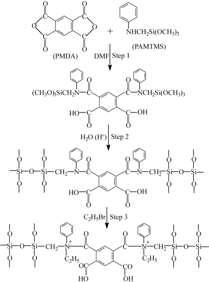 Zwitterionic hybrid polymers [142,143] were synthesized on the basis of ring-opening polymerization of pyromellitic acid dianhydride (PMDA) (a network builder) and phenylaminomethyl trimethoxysilane (PAMTMS), followed by the amination (Scheme 4).