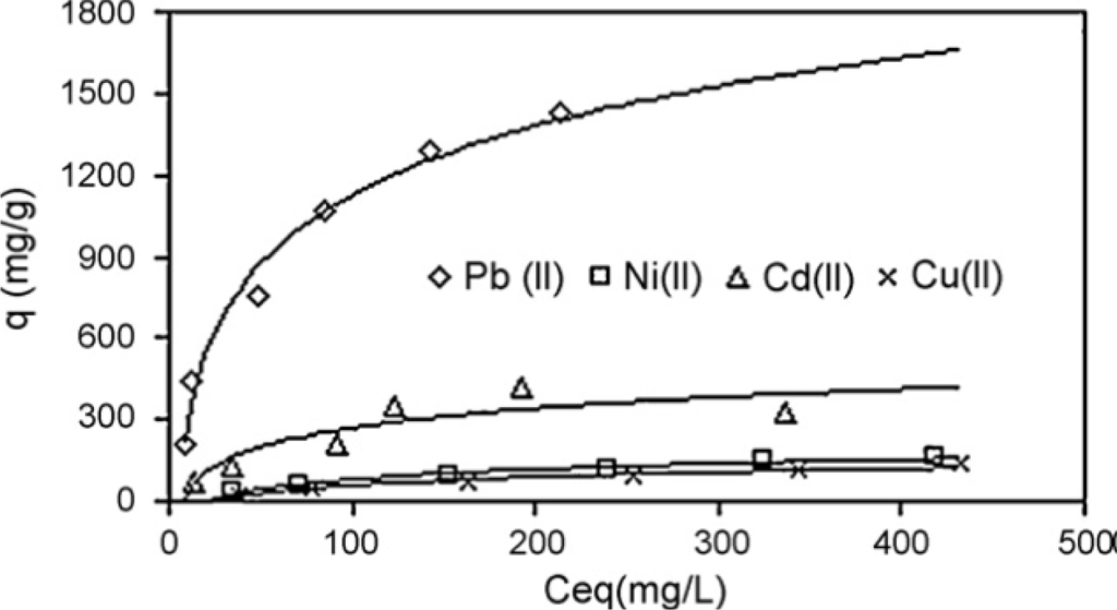 According to the kinetics experiments, the adsorption equilibrium was attained after about 10 min. Their experiments showed that at pH ≈ 5.5, Pb2+, Cu2+ and Cd2+ interact with oxygen atoms of –OH groups of these adsorbents. Authors believed that due to stronger interactions between metal ions and –OH groups of poly-GPTS/Ti(O)OH, the qmax values for the adsorption of Pb2+, Cu2+ and Cd2+ on poly-GPTS/Ti(O)OH (199, 42.79 and 39.41 mg/g, respectively) were bigger than those of poly-GPTS.