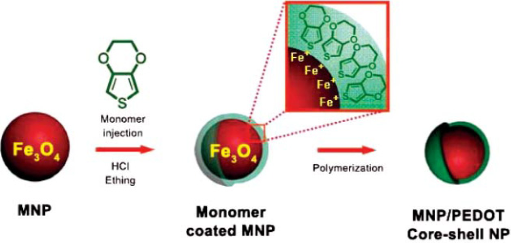 The used adsorbent was washed by 0.1 M HCl and the capacity of the regenerated sorbent through five cycles was detected to be 94% of the fresh one and equilibration time in the case of sucrose and PEG 4000 was 25 min. Also, qmax value of SiO2(CO2H)/chitosan for adsorption of Ni2+ was higher than that of SiO2/chitosan [241] which shows effect of support on the adsorption property of adsorbent [242]. Another material that was used frequently in core-shell nanocomposites was Fe3O4 magnetic nanoparticle [243–248]. These kinds of compounds can be separated with the help of an external magnetic force. In a number of works, organic polymers were used as shell for Fe3O4 core [243,244]. Jang et al. [243] encapsulated Fe3O4 by poly(3,4-ethylenedioxythiophene) (PEDOT) and used the produced compound (Fe3O4–PEDOT) for the removal of metal ions (Scheme 9). PEDOT has an excellent environmental stability and can interact with positively charged metal ions through its sulfur atom. The PEDOT shell has a lower surface energy than the core of magnetic nanoparticles, thus Fe3O4–PEDOT nanoparticles show amended stability and dispersibility in aqueous solutions, compared to pristine Fe3O4 nanoparticles. Adsorption experiments showed that adsorption capacities of Fe3O4–PEDOT nanoparticles were: Ag+ > Hg2+ > Pb2+. It was regenerated by acid treatment and the recovered adsorbent by ten cycles showed no loss in its adsorption capacity.