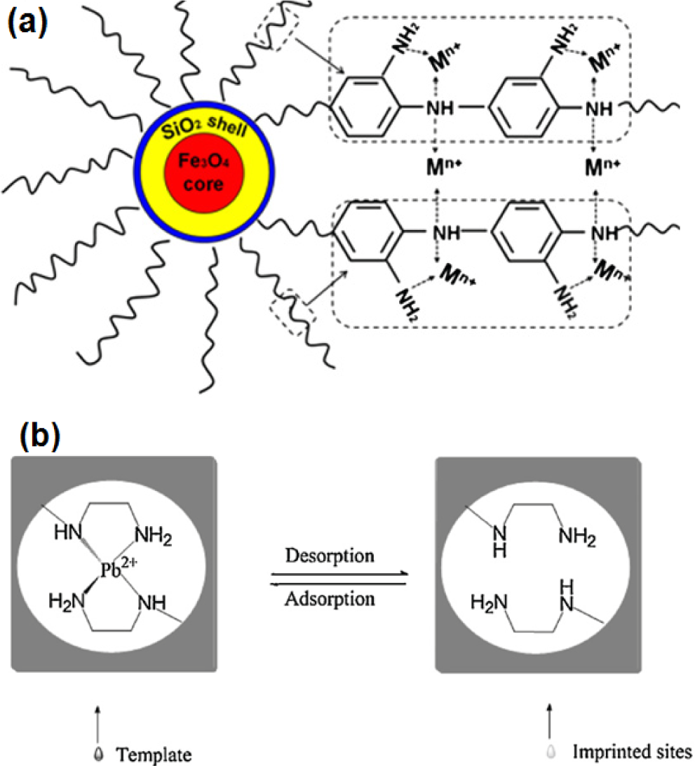 Some researchers have used two inorganic compounds (e.g., SiO2 and Fe3O4) as the core [251,252]. Firstly, they prepared Fe3O4 on which a layer of SiO2 was synthesized, and then carried out the polymerization on the surface of SiO2. Song et al. [251] synthesized Fe3O4–SiO2–poly(1,2-diaminobenzene) sub-micron particle (FSP) for the removal of Cr(III), As(III) and Cu(II). Zhang et al. [252] used 3-(2-aminoethylamino)propyltrimethoxysilane (AAPTS) as the functional monomer and Pb2+ as the template to prepare an ion-imprinted polymer (Fe3O4@SiO2@IIP) for the separation of Pb2+ ion from water (Scheme 10).