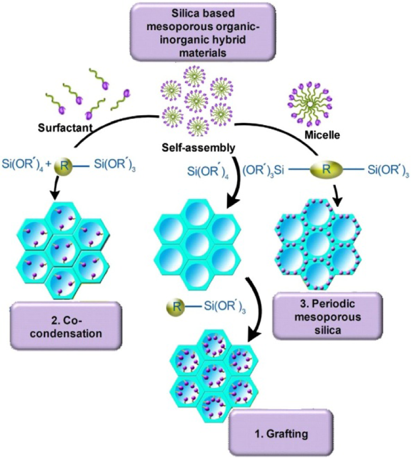 As illustrated in Figure 4, these organosilica compounds are prepared through (a) grafting or post-synthetic functionalisation; (b) co-condensation or one-pot synthesis and (c) synthesis of periodic mesoporous organosilicas (PMOs) [93,97,98]. In grafting processes, an organosilica is synthesized through condensation reaction between Si–OH groups of the pore walls of mesoporous silica and appropriate reagents such as, chlorosilanes (e.g., ClSiR3), alkoxyorganosilanes [e.g., RSi(OR′)3] etc. In the co-condensation method, an organosilica compound is prepared in one step through co-condensation reactions of tetraalkoxysilanes (e.g., TEOS) and an appropriate reagent (e.g., terminal trialkoxyorganosilanes) in the presence of a template. Syntheses of PMOs are carried out through the hydrolysis and condensation of bridged organosilane precursors of the type (R′O)3 Si–R–Si(OR′)3 in the presence of a structure-directing agent. In this method, R organic group are incorporated uniformly and periodically in the pore walls of resulted organosilica [93,98].
