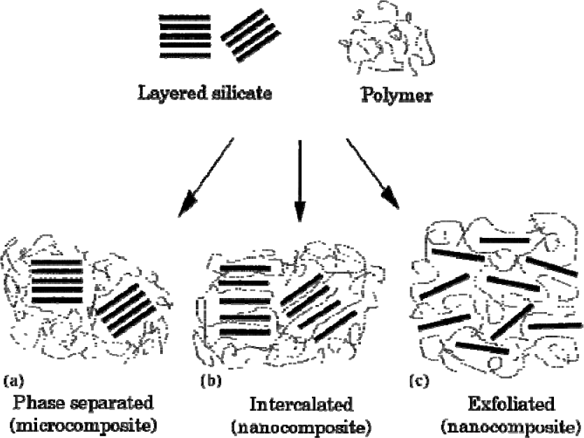To improve the physical properties of polymers, inorganic compounds physically are dispersed in them (as fillers) in various forms such as platelets, spheres, fibers, etc. If the size of discrete inorganic components is in the range of 1–100 nm, the resulted organic-inorganic compound is called a nanocomposite [111]. Organic-inorganic hybrid nanocomposites are either as interpenetrating networks which will be explained in Section 2.4 [99] or layered inorganic components embedded into the organic matrix.