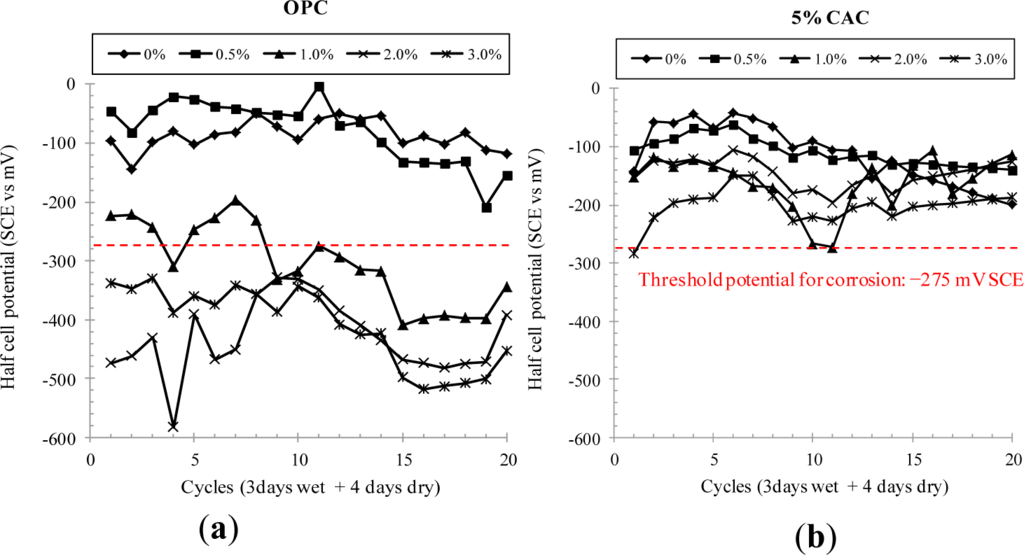 In a previous study on the semi-quantitative analysis of XRD, no Friedel’s salt was observed for OPC paste, whereas CAC paste still contained bound chlorides at a large portion even subjected to acidification [4]. Substantially it can be said that chlorides bound in the CAC matrix may be less released into free against a fall in the pH. In the majority of guidelines, it is advised that the maximum concentration of chloride ions at the depth of the steel must not exceed 0.2% or 0.4% by weight of binder [14,15], whilst the chloride threshold level for the onset of corrosion ranges from 0.4% to 1.2% by weight of binder [16]. In this study, it was found that the chloride threshold level is in the range of 0.5%–1.0% for OPC and CAC concrete, assessed by the half-cell potential method. In fact, CAC concrete may not provide any benefit in enhancing the chloride threshold level, apart from other advantages (i.e., strength development).
