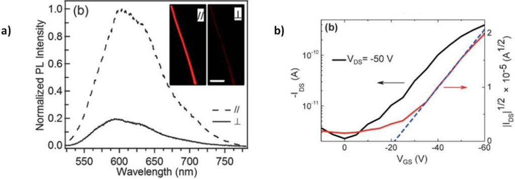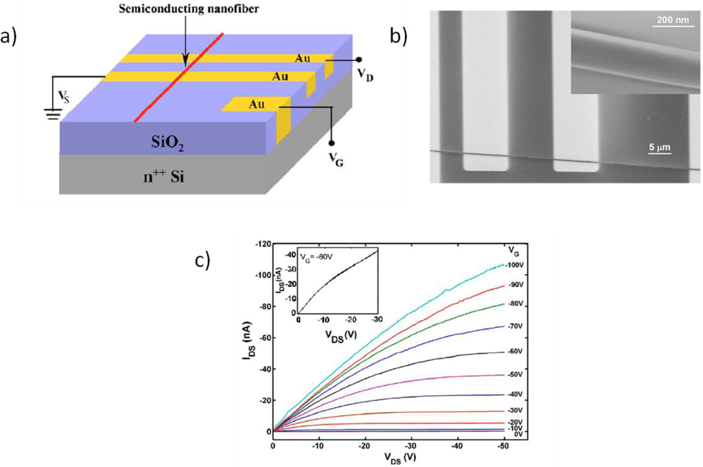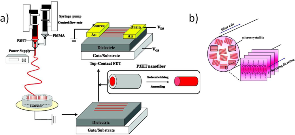 Further interest on the work of Chen et al. [] lies in the deep investigation that they carried out on the morphology induced within the fiber by the electrospinning process. They used optical adsorption and Wide Angle X-Ray Diffraction (WAXRD) to check crystallinity and π–π interaction, and polarized photoluminescence to eventually detect a preferred molecular orientation, as it is expected by polymers when they undergo elongational stress. They observed two interesting phenomena: first, a totally peculiar morphology characterizes the fiber, in which crystalline domains are embedded in an amorphous matrix and are oriented with the π–π stacking parallel- and the molecules backbone perpendicular- to the fiber main axis. They also demonstrated to be able to control the degree of crystallinity and consequently the transport properties of the fiber just varying the shell flow rate of the PMMA solution; in fact, this results in a tunable shear stress applied to the semiconductor core during its solidification, which in turn affects the amount of crystalline aggregation. This again represents an impressive case of solid control of the functionality of a polymer through its morphology by electrospinning.