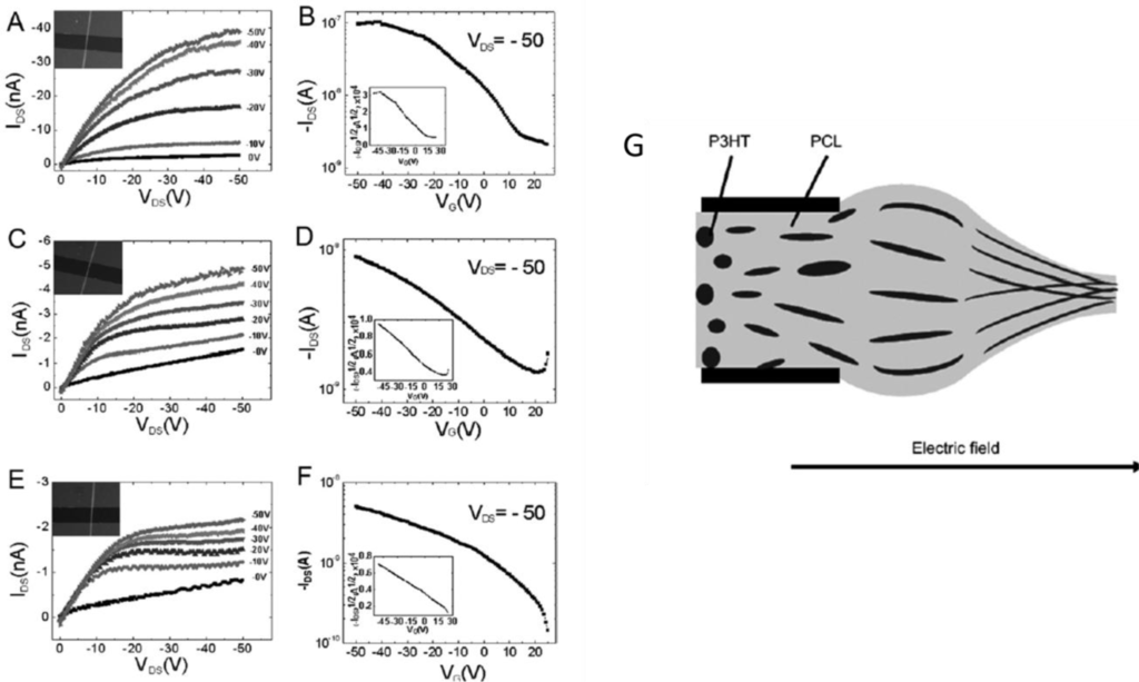 Electrospinning of polymeric blends is a general tool for tuning different properties of the fibers, like electrical and optical ones by using electroluminescent materials (MEHPPV) blended with high mobility semiconductors (P3HT) [], and more often viscoelastic and electrical ones, by combining a polymeric semiconductor with an a high viscosity insulating polymer, mostly aimed at assisting the jet stabilization and the fiber formation. However, the presence of the insulating polymer has often been associated with a reduction of transport properties in the semiconducting phase within the fiber. In the work of Pinto and coworkers of 2003, doped PANI was blended with high viscosity PEO to realize the first reported case of electrospun p-type single-fiber FET; a limited mobility of ~ × 10−3 cm2·V−1·s−1 was measured and associated to the presence of non conducting PEO between polyaniline chains []. In the work of Lee et al. [] P3HT/PCL blend low performances (~ × 10−3 cm2·V−1·s−1, even inferior when PCL ratio exceeding 30% is used) (Figure 12) are explained as an impeded formation of sufficiently big P3HT crystalline domains, but also impeded charge percolation due to defects within the semiconducting domains or traps at the interface between the semiconductor phase and the supporting polymer phase.