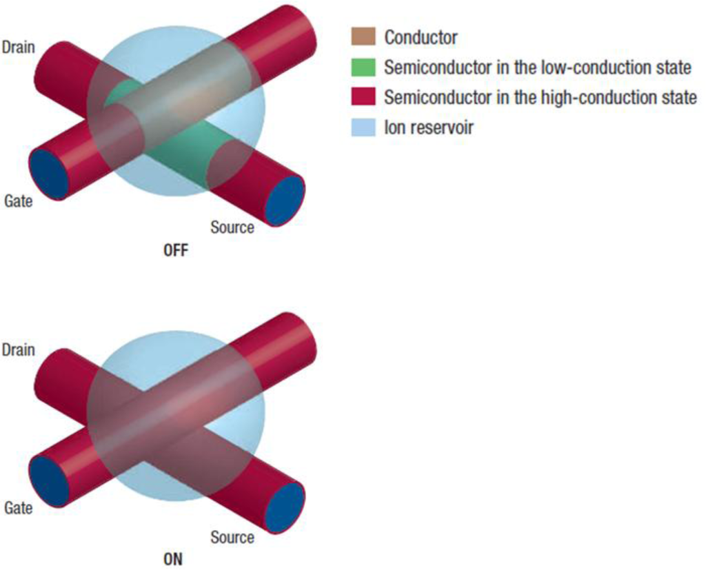 Already in 2007 and 2009, woven logic obtained using non-electrospun organic conducting and semiconducting fibers was demonstrated by Hamedi et al. [,]. In both works, the structural key of the illustrated tri-dimensional micro-electronics is the use of an electrolyte dielectric phase (Figure 14) [], which releases the FET geometry from the planar layered architecture and, as stated above, emphasizes fibers transport properties through an optimized dielectric coupling and a superior charge carrier density. In 2010, Lee et al. [] gave a good demonstration of the advantages deriving from the employment of electrospun organic semiconductors, in terms of contact area with the dielectric layer, substrate compatibility, extreme flexibility, and easy scale-up (Figure 8). With the aid of ion gel electrolytic gate, they realized reliable arrays of electrospun P3HT OFETs, on flexible substrate (Polyethylene Terephthalate), working at operative voltage inferior to 2 V (which are values realistic for practical use) and with mobility values of ~ cm2·V−1·s−1. Just recently, a solid demonstration of large-area flexible electronics was provided by the work of Sung-Yong Min et al. [] (2013); they proposed a setup for fast nanolithography based on the combination of the electrospinning working principle with a printing technology (Figure 15). With this setup they were able to align and pattern semiconducting nanowires with high speed, high precision and high reliability, achieving in ion-gel gated devices mobility up to ~0 cm2·V−1·s−1 and demonstrating working complementary circuit arrays (inverters) based on the patterning of both n-type (P(NDI2OD-T2)) and p-type (P3HT) nanofibers. They also observed P3HT/PEO microstructure, as obtained with their Nano-Wire Printer setup, and, differently from standard electrospinning, a well-established core-shell structure along the wire axis was found by TEM and elemental analysis, as an effect of a more effective phase separation.