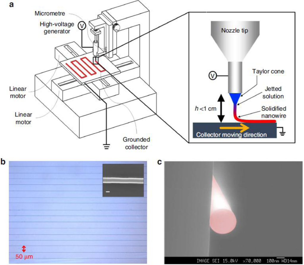 Such length increases with higher evaporation rate solvents or more viscous solutions, making near field electrospinning particularly suitable for melt electrospinning []. Also, alternated current and higher applied voltage have a contribution in the same direction, while lower voltages allow a more precise control over the spinning direction thanks to a lower flux acceleration []. Near field electrospinning presents similarities with inkjet printing: a modified printing apparatus called “high-resolution electrohydrodynamic jet printing” [] has been demonstrated also for the production of semiconducting nanowire arrays []. In case of precision electrospinning, the jet is continuous, while in case of printing lines are formed by the deposition of single droplets that coalesce onto the substrate. Although scanning collectors are usually employed, scanning tips have also been proposed to control the fiber deposition and alignment [].