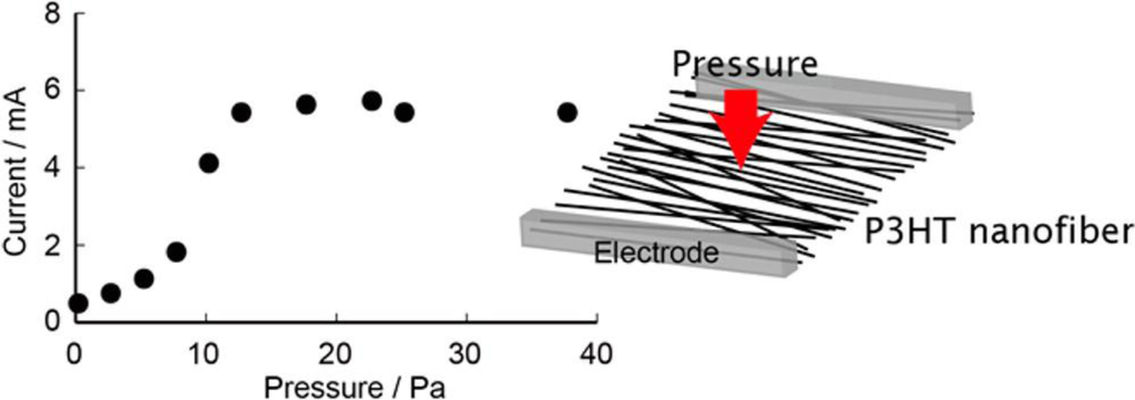 To close the picture with a further widening of the possible range of exploitation of electrospinning process, we like to stress that interesting and smart applications of electrospun semiconductor fibers beyond the logic have also been thought and developed. Among these, simple tactile sensors based on aligned electrospun P3HT nanofibers have been developed for detecting small pressure changes and bending angles, as proposed by Qiang Gao et al. [] in 2012 (Figure 16); single-fiber phototransistors and Light-Emitting Transistors (LIT) have been proposed by using electro-luminescent semiconducting materials [,]; finally, flexible and low-cost transistor memory devices based on hybrid P3HT: Au-nano-particles electrospun nanofibers have been recently published, exhibiting low operation voltages (± 5 V), large threshold voltage shifts (3.5–10.6 V), long retention ability (104 s) and good stress endurance (100 cycles) [].