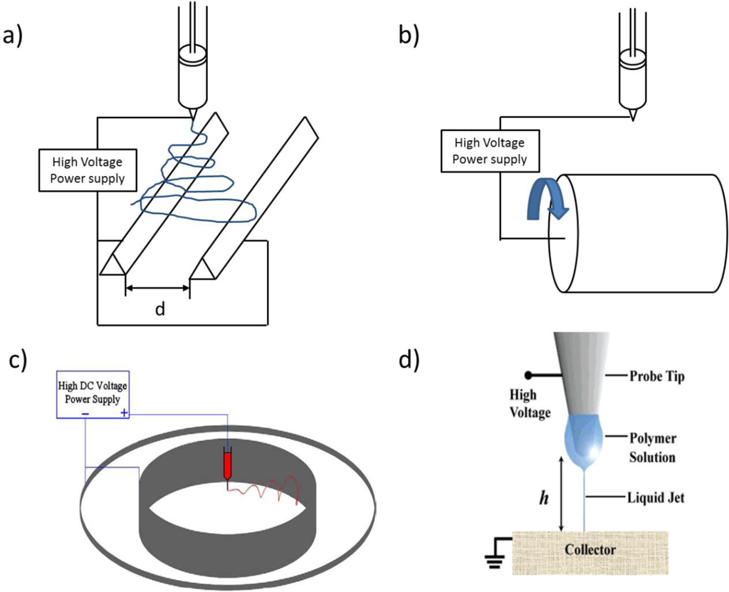 In recent years, the basic electrospinning setup has been modified to enhance process stability and fibers productivity or to produce fiber yarns, self-standing meshes or three-dimensional scaffolds. We refer to recent reviews for a comprehensive overview on the topic [,,,].