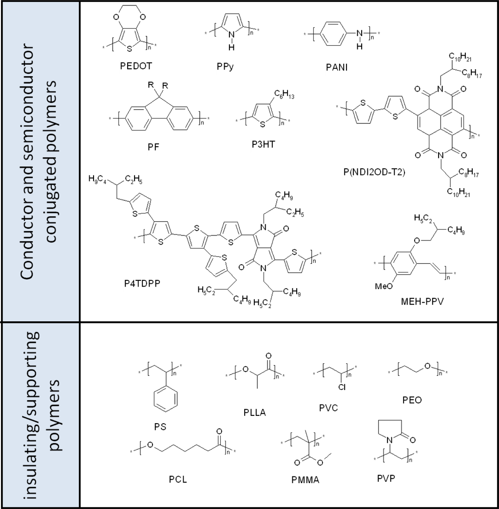 Within this broad scenario, electrospinning of conjugated polymers (in Figure 4 the most representative conjugated polymers processed by electrospinning are reported) provides additional requirements and challenges. Indeed, conjugated polymers are characterized by a limited solubility, by a relatively low average molecular weight and by a more rigid backbone: all these characteristics limit the number of entanglements that assist the fibers formation during electrospinning, preventing the jet breaking under the elongation strength. Moreover, though it has been shown that not-completely-good solvents may favor the spinnability [], a good polymer solubility is required to reach the minimum solution viscosity for fiber formation [].
