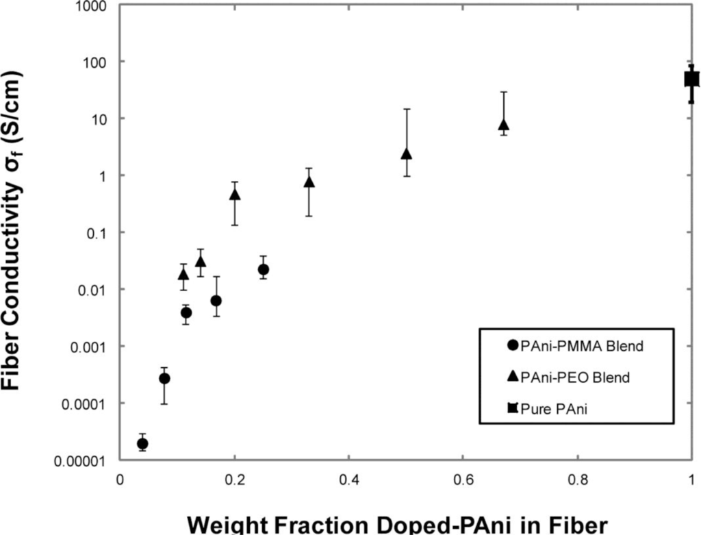 Remarkably, the first work on blend-based fibers [] reported one of the best performing results, namely PANI-PEO blend fibers with a conductivity of the mat of 0.1 S/cm, only slightly lower than the value measured on thin films, likely due to mat porosity.