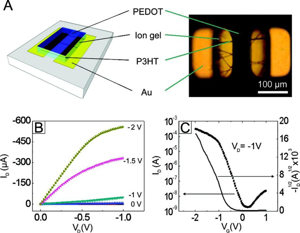 - Lee, S.W.; Lee, H.J.; Choi, J.H.; Koh, W.G.; Myoung, J.M.; Hur, J.H.; Park, J.J.; Cho, J.H.; Jeong, U. Periodic array of polyelectrolyte-gated organic transistors from electrospun poly(3-hexylthiophene) nanofibers. Nano Lett 2009, 10, 347–351. [Google Scholar]