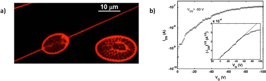 Polymeric semiconductors are recently experiencing extensive interest because of the increasing enhancement of their electrical properties (e.g., charge carriers mobility) and the wide range of scalable processes that allow their deposition from solutions [,,–]. Despite generally thought for thin-film-based electronics, their formation within the cylindrical shape of the electro-spun fiber introduces many appealing aspects: a reduced amount of material consumption along with the intrinsic confinement of the active area, an increased surface-to-volume ratio for better functional interfacing (which is essential for sensing application and/or whenever anchoring sites are employed to enhance a specific property), improved flexibility and the possibility to finely pattern the active area just through the definition of the number and the direction of the nano-/micro-fibers employed within a device geometry; moreover, from a fundamental point of view, electro-spun nano-fibers may represent model systems for mono-dimensional charge transport study.