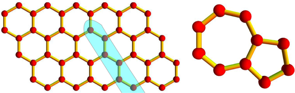 An edge dislocation in the graphene sheet, centered on the origin, is obtained by cutting the plane; let us say in correspondence of the negative x1 half axis and by adding a half line of carbon atoms [45]. In the case of a hexagonal lattice, the line of atoms could be interpreted as an armchair row. In fact, the whole honeycomb lattice could be recovered by arranging arrays of armchair rows in a square structure. The dislocation produces a pentagon-heptagon pair in the origin of the frame, as shown in Figure 1. In the unrelaxed structure, the other hexagons are not affected. This kind of defect does not mix the valleys. Smooth potentials are likely not to change the isospin and the valley of the scattering electrons, nor their energy spectrum, drastically, unless the strain produces gaps or zero energy states [4,33].