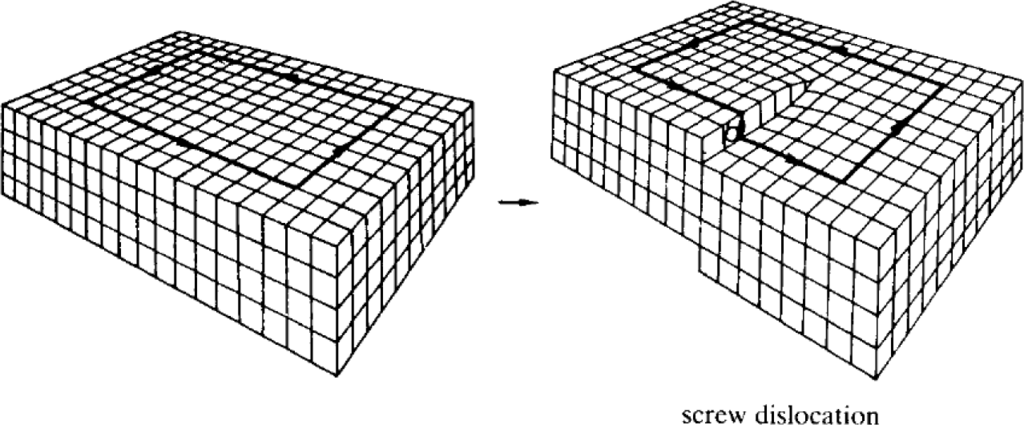 In a 3D material, a screw dislocation can occur. The Volterra process for the creation of such a defect requires cutting the material along a half plane. Next, the two free surfaces are twisted with a relative displacement along the direction of the plane and glued back, so that the right-hand side is displaced upward and the left-hand side is displaced downward, as shown in Figure 2. It has been shown that, in a 3D TI with inversion symmetry, a screw dislocation of Burgers vector, , harbors two gapless Dirac modes, which propagate helically along the screw axis, but are localized in the radial direction, provided the constraint: