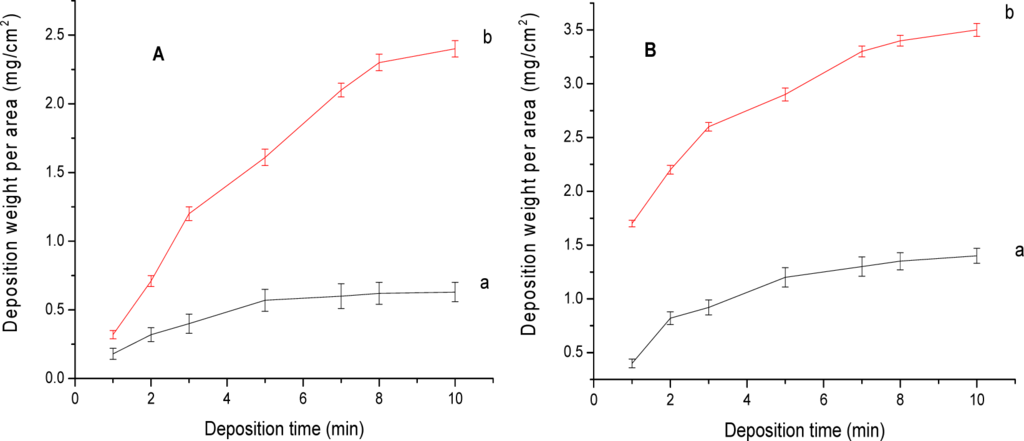 After a trial-and-error sequence of experiments, the optimum voltages (10 and 30 V) and deposition time (from 1 to 10 min) were chosen. Figure 1 shows a continuous increase in the deposition weight with increasing deposition time for C-hBN2 (Figure 1A) and C-Ti-hBN (Figure 1B) suspensions. Three different samples were prepared for each deposition time and the final results were averaged (error bars in Figure 1 refer to the standard deviation). The deposition yield measurements were found to be repeatable with an error below 8% and 7% for C-hBN2 and C-Ti-hBN, respectively. It is observed that the slope of the curves decreased with increasing deposition time due to the formation of an electrically insulating film which decreases the voltage drop in the bulk of the suspensions. Increasing the voltage from 10 to 30 V (curves a and b in Figure 1A,B, respectively) resulted in a higher deposition yield which is in agreement with the prediction of Hamaker’s equation [40]: