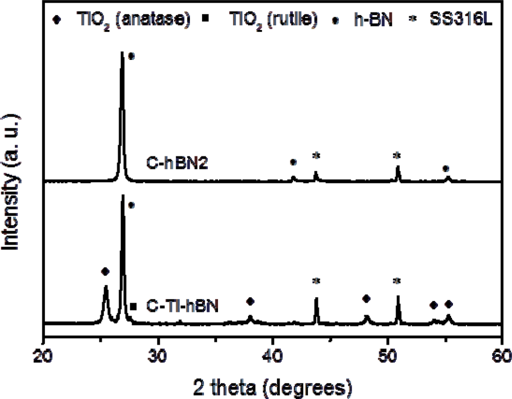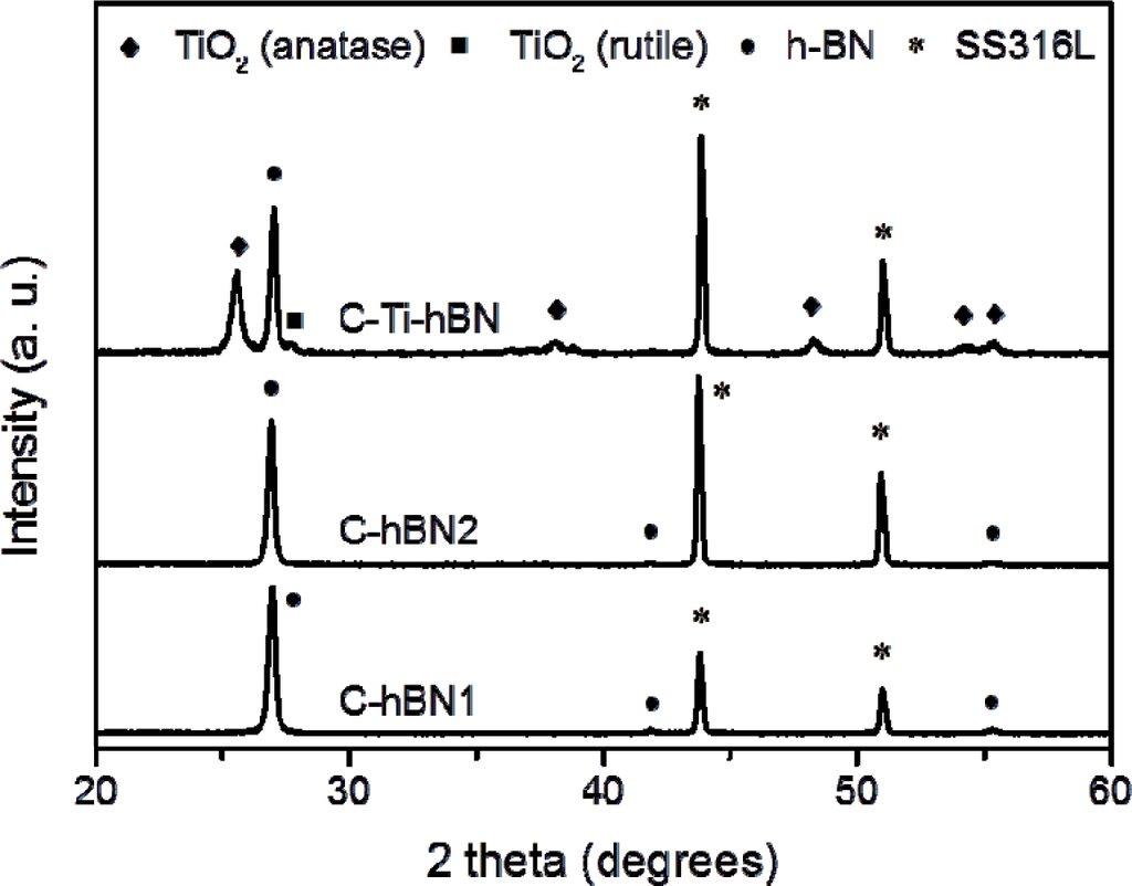 The XRD patterns of C-hBN1, C-hBN2 and C-Ti-hBN coatings are shown in Figure 3. As it can be observed, the peaks corresponding to h-BN appear in all coatings while for C-Ti-hBN, the titania peaks are present. All peaks were indexed using JCPDS files 01-085-1068 for boron nitride also00-002-0406, 01-078-2486 for anatase TiO2 and 00-021-1276 for rutile TiO2. The identification of both h-BN and titania in the XRD spectra corroborates the presence of both materials in the coatings as was first indicated by FTIR test.