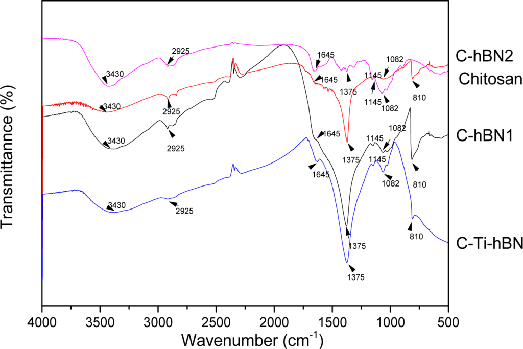 In C-hBN1 (chitosan-1 g/L h-BN), C-hBN2 (chitosan-2 g/L h-BN) and C-Ti-hBN (chitosan-2 g/Lh-BN-2 g/L TiO2) spectra, the characteristic C-O and C-H stretching vibrations of the chitosan molecules appear at 1082 cm−1 [18] and 2925 cm−1 [1], respectively. The peaks at 1645 cm−1 and 3430 cm−1 are assigned to the N-H bending of the amines groups and the O-H stretching vibration of the chitosan molecule [1,41–45], respectively. The C-O-C symmetric stretching vibration can be seen at 1145 cm−1 [18] and the symmetric deformation of CH3 group appears at 1375 cm−1 [1]. The BN stretching vibration appears at 810 cm−1 [18]. All these peaks indicate that both, chitosan and h-BN are incorporated in the coating. In addition, there is a broad band that spreads below 800 cm−1 which, according to the literature [1,46–48], indicates the presence of titania in the coating.