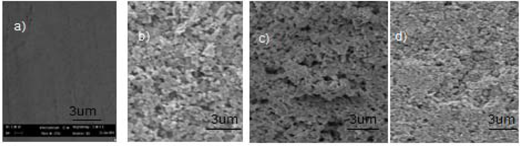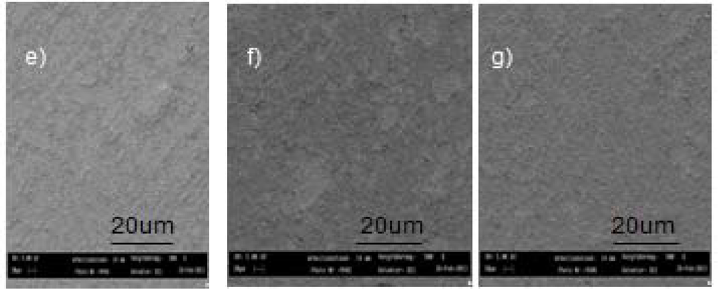Figure 4 shows SEM images of C-hBN1 (Figure 4b,e), C-hBN2 (Figure 4c,f) and C-Ti-hBN (Figure 4d,g) coatings obtained using 10 V and 5 min as EPD conditions. An image of the SS substrate (Figure 4a) is also shown for comparison purpose. Images taken at low magnification (Figure 4e–g) show that the films are continuous and crack-free, while the images taken at high magnification(Figure 4b–d) indicate that the films are relatively dense, although some porosity can be observed. No significant qualitative differences are seen in the microstructure of the coatings when the h-BN concentration is increased from 1 g/L (sample C-hBN1) to 2 g/L (sample C-hBN2) as revealed when comparing Figure 4b,c, respectively. Regarding the porosity, it can be seen that the sample obtained with titania (C-Ti-hBN) seem to be less porous than the other ones. This could be due to the smaller particle size of the titania which enables it to fill gaps that have been created between the h-BN particles and, therefore, decreasing the porosity.