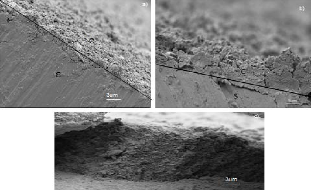 SEM images of the cross sections of C-hBN1, C-hBN2 and C-Ti-hBN samples (Figure 5a–c, respectively) show that films were fairly uniform although for sample C-hBN2 (Figure 5b) the thickness seems to be distorted, possibly due to the machining process for SEM observations. In Figure 5a,b, the coatings (denoted by C) are seen to cover the substrate (denoted by S) to a large extent. The thickness achieved was around 2 μm for sample C-hBN1 and varied from 0 to 4 μm when the concentration of h-BN in chitosan changed to 2 g/L (sample C-hBN2). However, a maximum thickness of ~12 μm was achieved for C-Ti-hBN which correlates with the higher yield measured for this sample, when titania is also incorporated in the coating (as shown in Figure 5c).