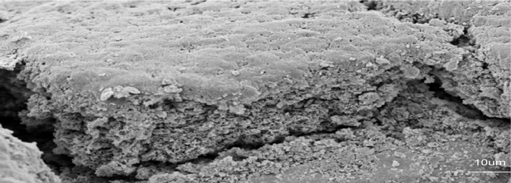It can also be observed that microcracks are formed on the coated surface. This is due to the formation of a relatively thick layer, which undergoes rearrangement upon contraction during drying, where the shrinkage of the deposit coating could be substantially different from the substrate and as a result, tensile/compressive stresses are developed in the coating and relieved by the formation and propagation of cracks. If the layers were thinner, the formation of cracks would be less accused since the ratio h-BN/chitosan would be lower, and also considering that the metallic substrate would have adhered better to the thinner h- BN layer embedded in chitosan.
