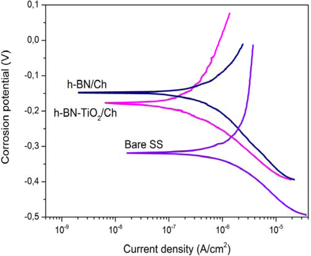 Analysis of the film showed suitable adhesion strength to the substrate for chitosan/hBN and chitosan/hBN/TiO2. Also, enhanced corrosion resistance compared to bare SS substrate before deposition was confirmed showing that chitosan/h-BN/TiO2 provides better corrosion protection than chitosan/h-BN coatings. The results of this investigation showed that EPD is a versatile method for the fabrication of chitosan based composite materials. The results confirm that the composite coating would act as a protective layer to provide corrosion protection and also improved adhesion strength. The application of the developed coatings as antibacterial layers is the focus of current studies.