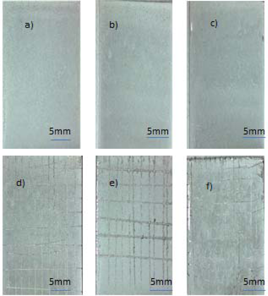 The adhesion between coatings and substrates was tested by the tape test according to ASTM standards [54] using Elcometer 107 cross hatch cutter (Manchester, UK). The tests were carried out by using a cutting tool and this was placed on the substrate at 90 degrees to make a series of parallel cuts (approximately 20 mm long) by pressing down and pulling the tool towards the operator. A suitable length of adhesive tape was selected and centered over the lattice. After a short time (about 90 s), the tape was removed at an angle of 180 degrees to the coating surface. At the end, the lattice of cuts was compared with ASTM standard. The ASTM standard values for adhesion strength assigns six quality classes, namely 5B for 0% removal, 4B for less than 5% removal, 3B for 5%–15% removal, 2B for 15%–35% removal and 0B for more than 65% removal [54,55].