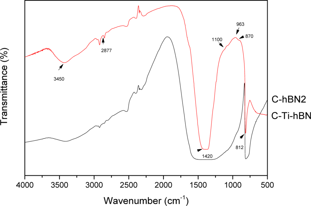 FTIR analyses for coated samples were carried out to investigate the interaction between the chitosan matrix, h-BN and TiO2 particles. Three coatings of each system were used for the measurements and a chitosan reference was also analyzed. FTIR spectra of C-hBN1, C-hBN2 andC-Ti-hBN2 are shown in Figure 2.