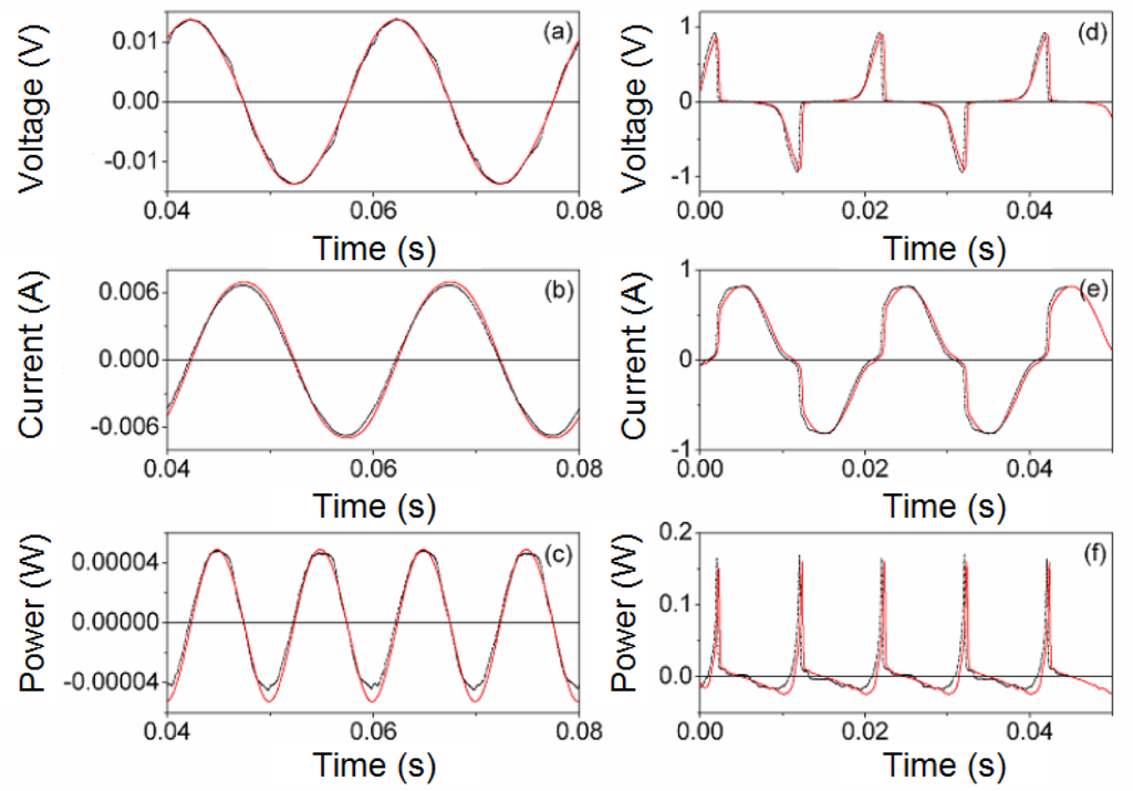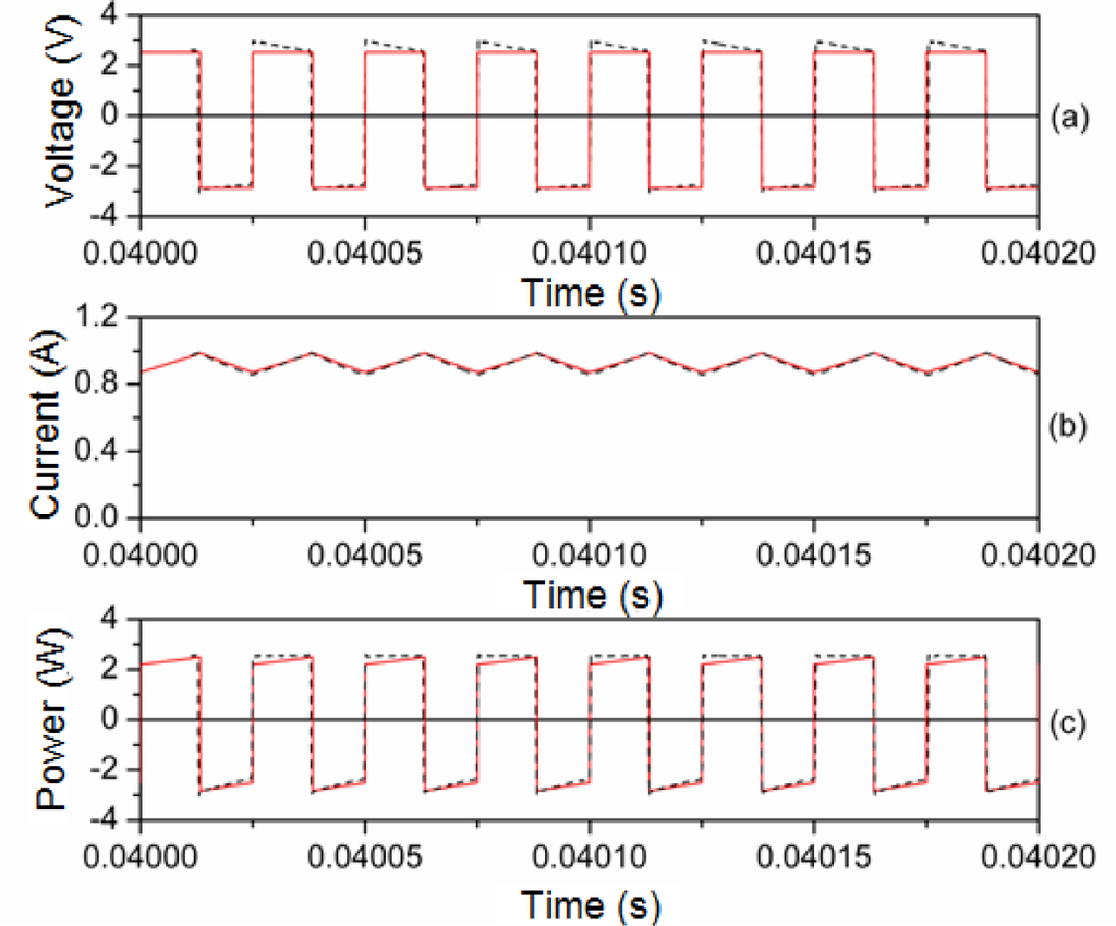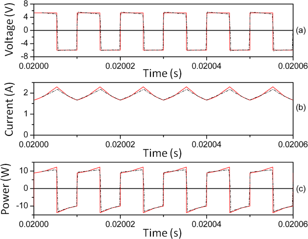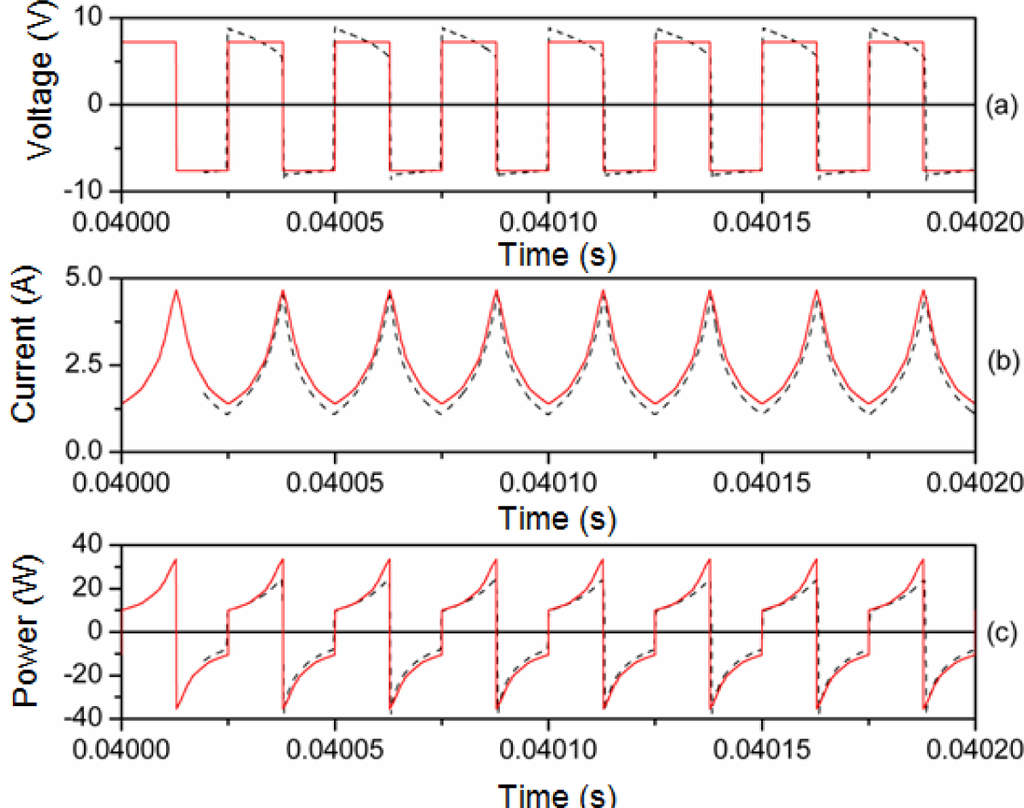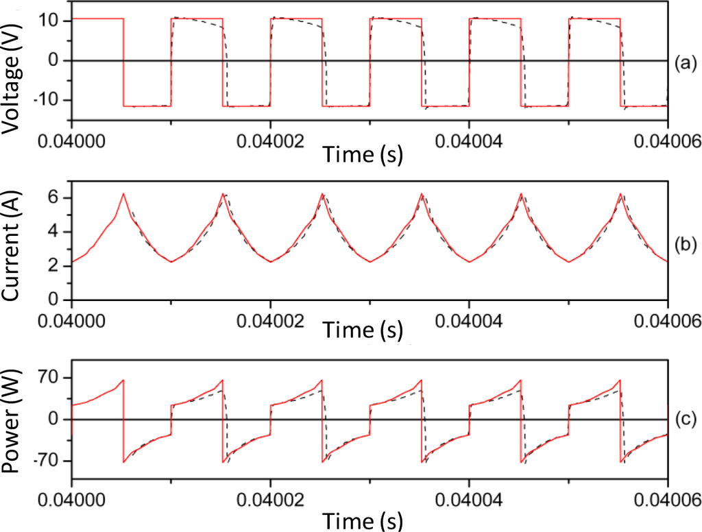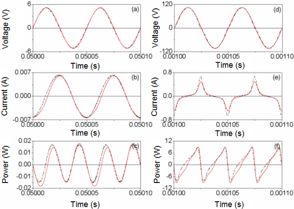 In order to verify that the effect of power losses are also reproduced in our model, in Table 2 we present the experimental and computed powers for three values of Vin (linear, intermediate and saturation regions) and two frequencies (40 kHz and 100 kHz). As can be seen and as happens in the case of the sinusoidal excitation, the computed powers , although small, increase with frequency and to a lesser extent with Vin as typically observed experimentally.