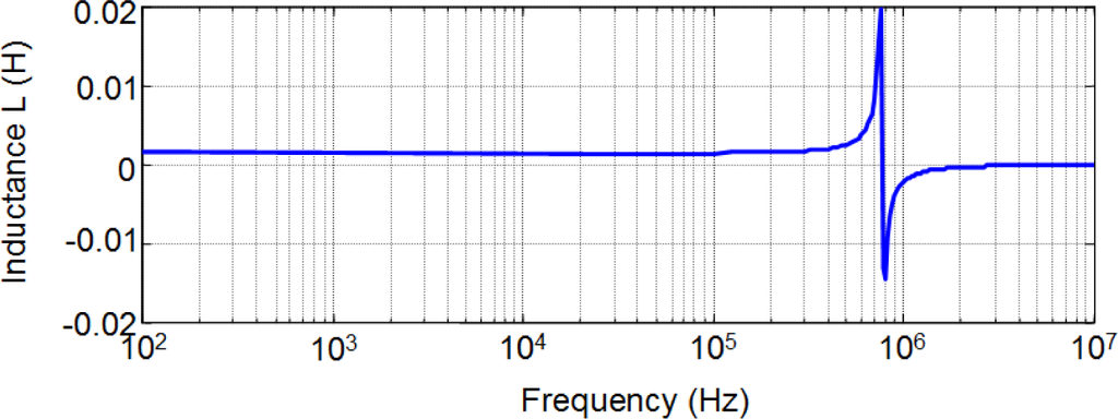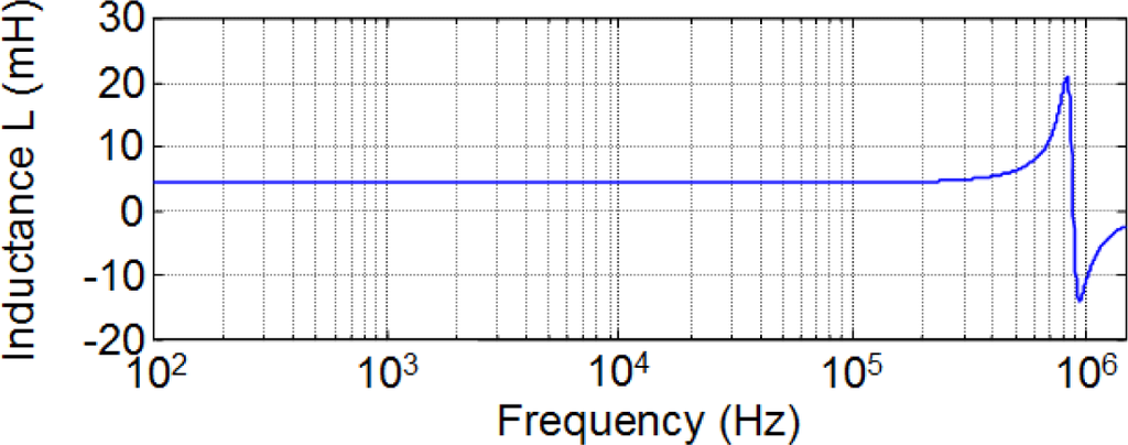 To investigate the frequency dependence of L in a wide range of operation frequencies up to the order of Megahertz we have carried out experimental measurements in the form of frequency sweep using a precision impedance analyzer. This includes the typical operation frequencies used for many switched mode power supply applications (higher than 100 kHz). We carried out the measurements in a laboratory at Carlos III University of Madrid. To do this we used a Hewlett Packard 4194A precision Impedance/Gain-Phase Analyzer (Agilent Technologies, Santa Clara, CA, USA). In Figure 13 we show the results for a 28-turn RM14/I ferrite inductor and in Figure 14 we show the results for a 28-turn E47/20/16. In both cases the sweep covers frequencies from 100 Hz to over 1 MHz. As can be seen, the inductance L is approximately constant and independent of frequency. The resonant frequency for the RM inductor is about 832 kHz while in the case of the E inductor it is about 768 kHz. The observed variations of L correspond to the resonant frequency.