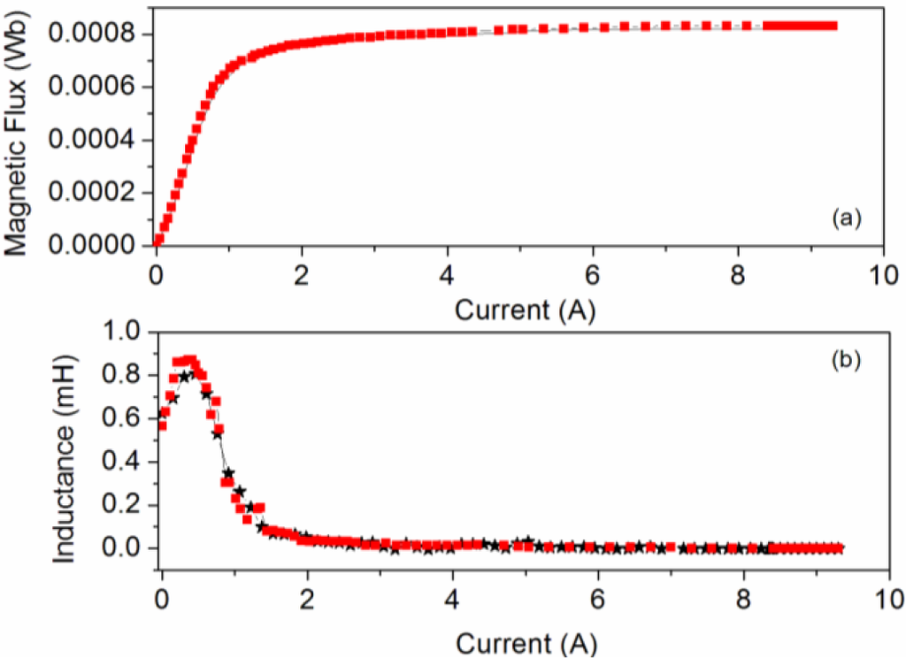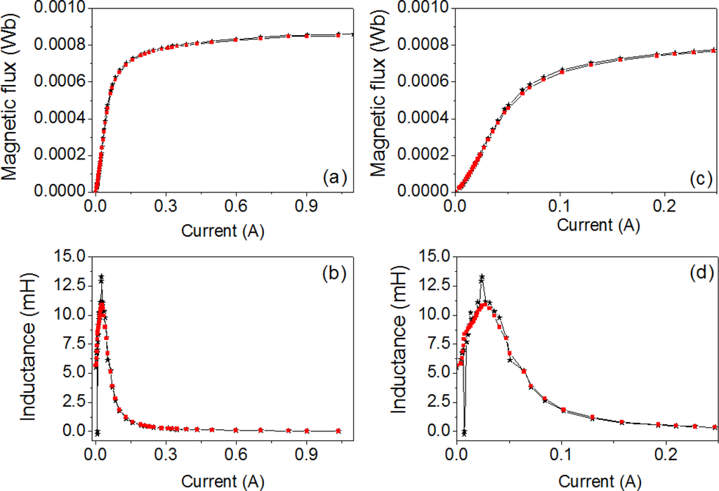 The objective of the measurements is to obtain the B-H curve that characterizes the core material of the ferrite from the linear to the saturation regions. This curve is an input parameter in the simulation program. We derive the B-H curve from the Φ-I curve. For this we build a two-winding transformer with the same number of turns in the primary (Np) and secondary (Ns) coils. For the transformer we use a toroidal ferrite core with the same material as the inductor to be studied. We apply a variable DC current I, generated from a DC power supply, to the primary coil. We measure the magnetic flux Φ in the secondary coil with the Magnet-Physik electronic fluxmeter (Köln, Germany) from the linear to the saturation regions. With these values we compute B and H as follows: