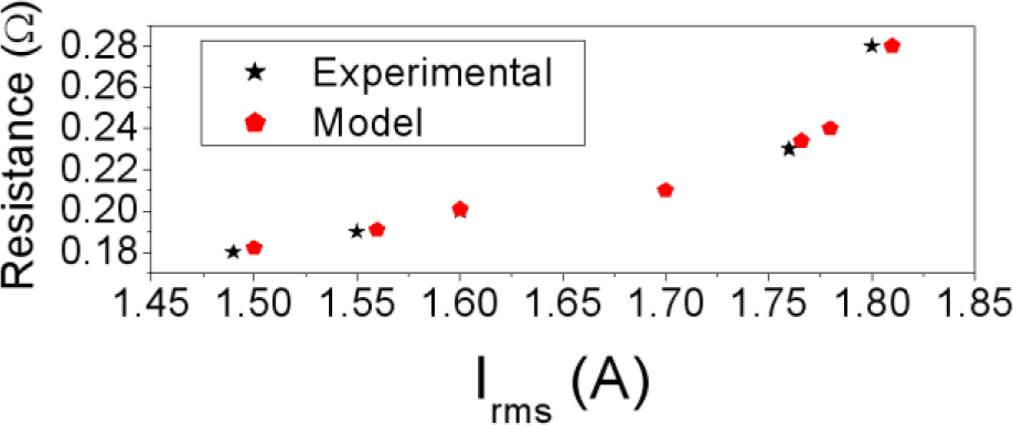 At the postmodeling step we compute (average value of the power) and Irms (rms values of the current waveform). The R value is calculated as . By repeating the simulation at different excitation voltage values, we obtain the curve and from this derive the R−Irms curve.