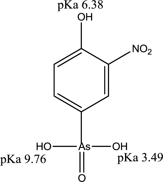 Arsenic species occur naturally in surface water such as rivers, lakes, reservoirs, and ponds by the natural processes of soil erosion, mineral leaching, volcanic deposits, and geochemical weathering processes [1]. Anthropogenic inputs to the atmosphere through mineral smelting operations, fossil-fuel combustion, and consumption of organo-arsenicals by poultry contribute to the overall fate and distribution of arsenic: geological and anthropogenic activities (e.g., (CH3)3As, As4O6(s), As4O10(s)) → water pollution → soil and sediments → bioaccumulation [2]. Arsenic has variable oxidation states in the environment (3−, 0, 3+, and 5+), particularly in aquatic environments where the speciation depends on the relative redox potential and the pH conditions [3]. Common occurring forms of arsenic are its oxyanions (arsenite (As3+) or arsenate (As5+)) [3], where the latter is the most thermodynamically stable form in surface water environments. Arsenite is relatively stable under mild reducing conditions in anoxic ground waters and is considered the more thermodynamically stable form [3]. In most natural waters, arsenic (III) occurs as the non-ionized form of arsenous acid (H3AsO3, pKa = 9.22) and may interact weakly with most solid surfaces [4]. Depending on the pH and oxidizing conditions, the efficient isolation of various protolytic forms of arsenic (III) species with traditional treatment methods such as adsorption, precipitation, etc., represent a technical challenge [4]. Roxarsone (4-hydroxy-3-nitrobenzene arsonic acid) shown in Figure 1 is an aryl-arsenical feed additive for swine and poultry which promotes weight and serves as an anti-microbial agent. Roxarsone may contaminate soil and surface water supplies through the uncontrolled use of poultry litter as a fertilizer additive [5,6]. Roxarsone partially degrades via metabolic pathways in poultry and in soil environments which may yield more toxic inorganic forms of arsenic (i.e., arsenite and arsenate) [7–10].