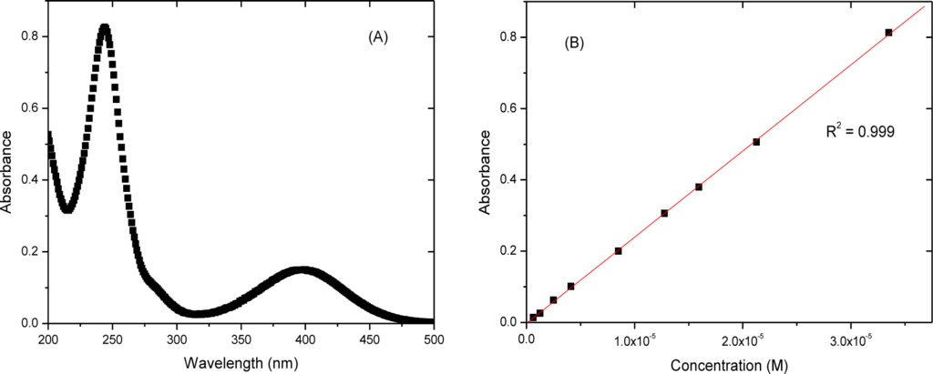 Calibration curves of roxarsone (Figure 2) were obtained using UV-vis absorption spectroscopy. The molar absorptivity (ε) of roxarsone at pH 7.00 was 27.3 × 103 M−1cm−1 at λ = 244 nm, in agreement with an independent estimate for roxarsone (ε = 22.9 × 103 M−1cm−1) at λ = 224 nm [24]. The spectral bands at 400 nm and 244 nm arise from electronic transitions of So → S1 (n-π*) and of So → S2 (π-π*), respectively.