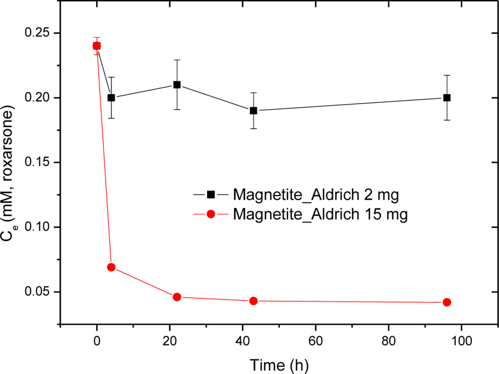 The initial experimental conditions employed roxarsone (Co = 0.24 mM, V = 0.020 L) at pH 7.00 in water at 21.0 °C for 4, 22, 43, 96 h with 200 rpm shaking are shown in Figure 3, where Co is the initial concentration of roxarsone. The time required to reach sorptive equilibrium for roxarsone with commercial magnetite (Aldrich) exceeded 20 h. According to Figure 3, an equilibration time used herein for the sorption of roxarsone was 24 h for an adsorbent dosage of 15 mg at these conditions. The use of higher dosages of adsorbent for the isotherm studies minimizes the random errors related to sample weight and residual levels of unbound adsorbate (Ce), as shown by the calibration data in Figure 2b.