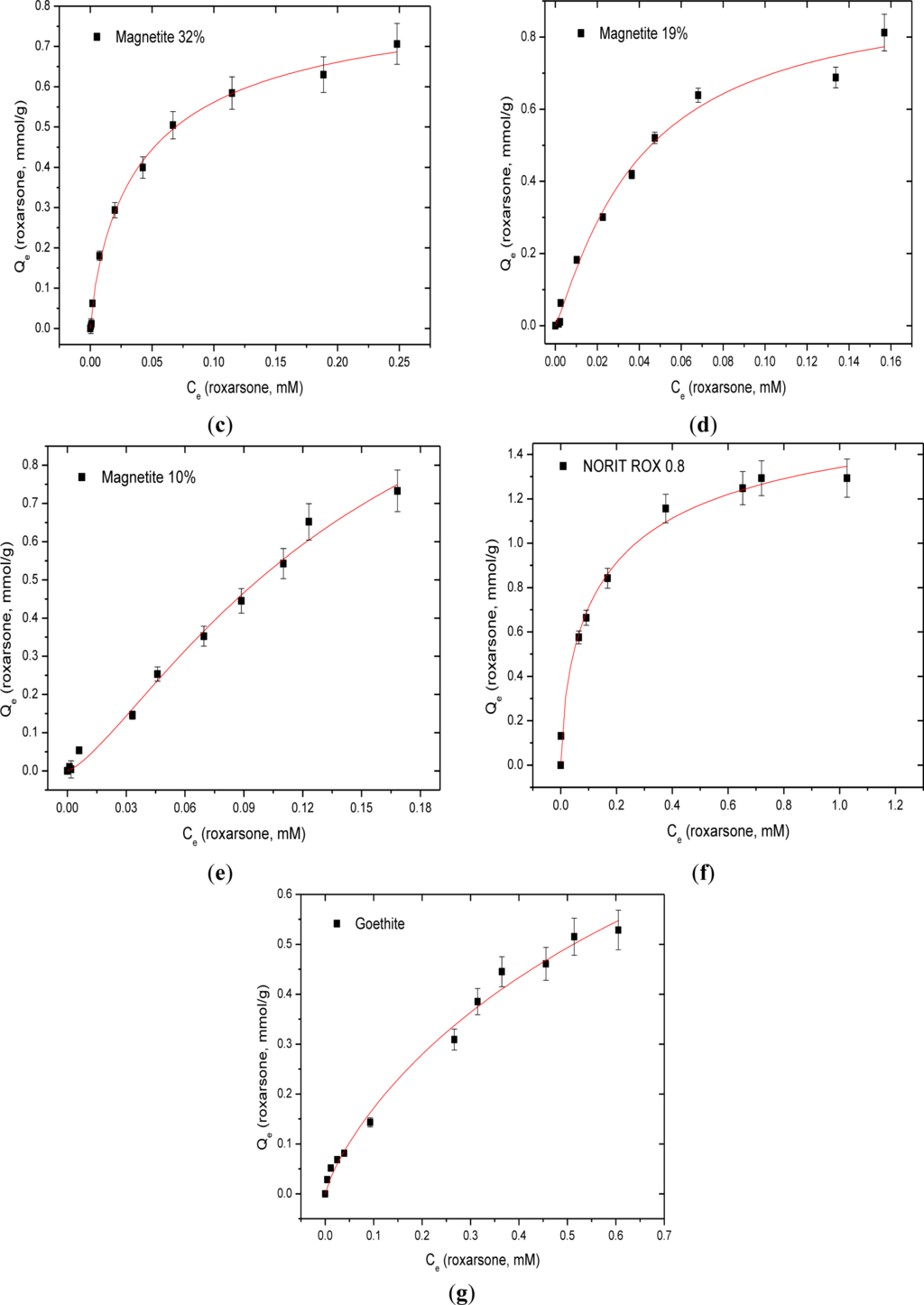 The sorptive uptake results at isotherm conditions for roxarsone with synthetic magnetite (Mag-P), commercial magnetite (Mag-C), GAC-magnetite composites with variable magnetite (32%, 19%, and 10%; w/w%) content, and goethite are shown in Figure 4 and Table 1. The maximum monolayer adsorption capacity of roxarsone (Qm = 1.783 mmol/g) was achieved with GAC. Although GAC contains a relatively low intrinsic level of Fe content [17] as an impurity due to its synthetic preparation, the sorptive removal of roxarsone is attributed primarily to noncovalent interactions such π-π stacking and H-bonding between the phenyl ring of roxarsone and the graphene surface of GAC. In the case of composite materials (CM-10, -19, and -32), the Qm value of roxarsone increased as the content of the activated carbon content increased, as anticipated for adsorptive processes influenced by the hydrophobic effect. By contrast, the iron oxide components such as magnetite, goethite, and magnetite composites which possess π-electron acceptor (Lewis acid) sites due to the presence of iron species on the adsorbent surface, especially for inorganic arsenate [12,21–23]. As well, favourable Lewis acid-based interactions may contribute to the formation of coordination complexes on the iron oxide surface because complexes between Fe species and the oxygen atoms of the roxarsone anion [25,26]. Adsorption of roxarsone on the heterogeneous surface sites of magnetite composites (CM-10 and CM-19) are supported by the exponent term (n > 1) from the Sips isotherm modeling parameters. Mag-C showed Langmuir adsorption (n = 1) because of its relatively uniform and homogeneous surface.