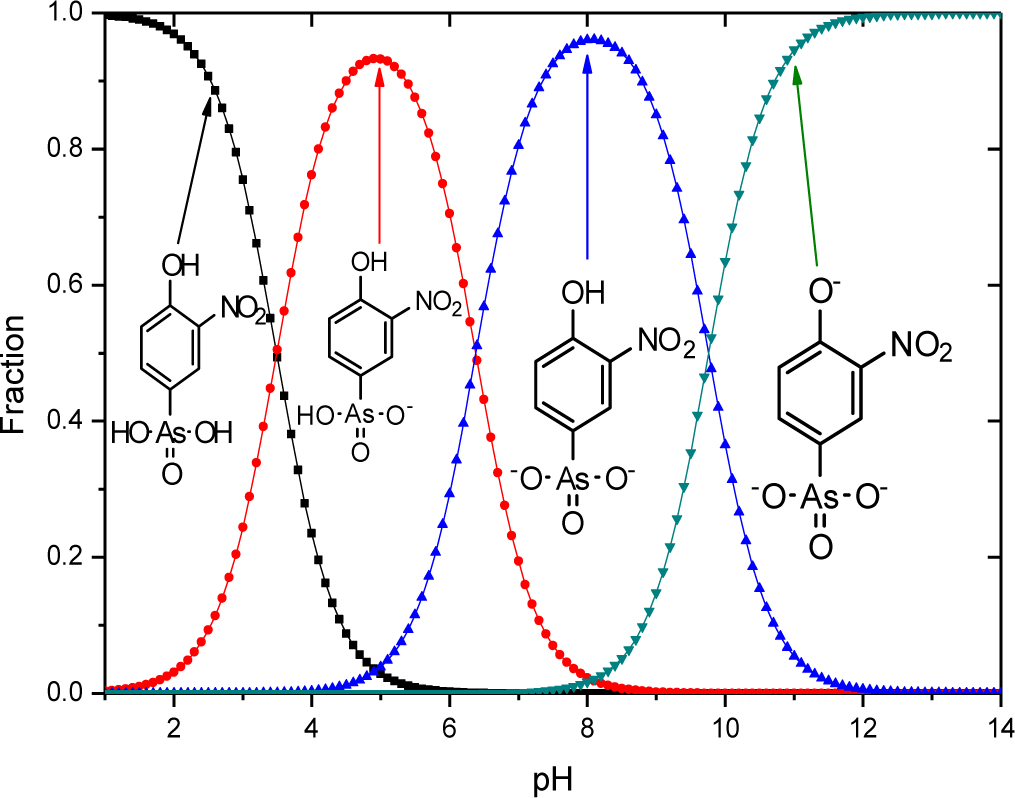 The sorptive uptake of roxarsone in aqueous solution depends on various factors: pH, buffer system, ionic potential of adsorbate, and pHpzc of adsorbent. The advantage of employing a buffer solution instead of an unbuffered aqueous solution for sorption relates to the ionic strength and constant pH in the case of a buffer. As the concentration of buffer exceeds that of the adsorbate, the activity of the adsorbate approaches unity due to the increased dissolution of the adsorbate by the increased hydronium ion concentration from the buffer resulting in greater dissolution of adsorbate by protolysis [29]. Moreover, controlled speciation of an adsorbate occurs when the pH of the system is maintained. For example, an adsorbate with multiple protonation and oxidation states such as the oxoanions of Se and As (e.g., SeO32−, SeO42−, AsO33−, and AsO43−) which may exits various protolytic forms depending on the solution environment during sorption or analysis. In the case of UV-visible absorbance measurements, pH variation may occur due to the hydrolysis of CO2 in air, especially in unbuffered aqueous solution. With increasing ionic strength of the buffer system, electrostatic repulsion between an adsorbent and an adsorbate decrease due to the constriction of the electric double layer of the adsorbent as ionic strength increases. Selection of the buffer is important because an ion with the highest ionic potential in solution will interact first with the adsorbent. Therefore, the ionic potential of the buffer should be lower than that of the adsorbate. The ionic potential (ψ) is the ratio of the adsorbate oxidation state number (z) over the ionic radius (r) of the adsorbate ion (ψ = z/r); where r = 0.6 nm (phthalate), r = 0.42 nm (roxarsone, neutral), r = 0.45 nm (selenite), and r = 0.4 nm (phosphate: H2PO4− and HPO42−). As the ionic potential of the adsorbate increases, stronger interactions occur between the adsorbate and the adsorbent. Another factor affecting the sorption behaviour is the pH because the net surface charge of the adsorbent is zero when the pH matches the pHpzc of the adsorbent. Thus, the pH conditions can be chosen to maximize the electrostatic interaction between adsorbate and adsorbent in solution by accounting for the pKa of the adsorbate and the pHpzc of the adsorbent. If the pH (solution) < pKa (adsorbate) and pHpzc (adsorbent), the surface of the adsorbate and the adsorbent are positively charged. The surface of the adsorbent and adsorbate are negatively charged for the opposite case; pH (solution) > pKa (adsorbate) and pHpzc (adsorbent). At these boundary conditions, sorptive uptake will be negligible due to electrostatic repulsion between the adsorbate/adsorbent systems. At the following condition: pHpzc (adsorbent) < pH (solution) < pKa (adsorbate), the surface charge of the adsorbate is positive, the adsorbent is negative, and the maximum sorptive uptake is possible. At the following condition: pKa (adsorbate) < pH (solution) < pHpzc (adsorbent), the surface charge of the adsorbate is negative, the adsorbent is positive, and maximum sorption uptake is also possible [30]. Roxarsone has three pKa values in aqueous solution and its speciation at variable pH is shown in Figure 5.