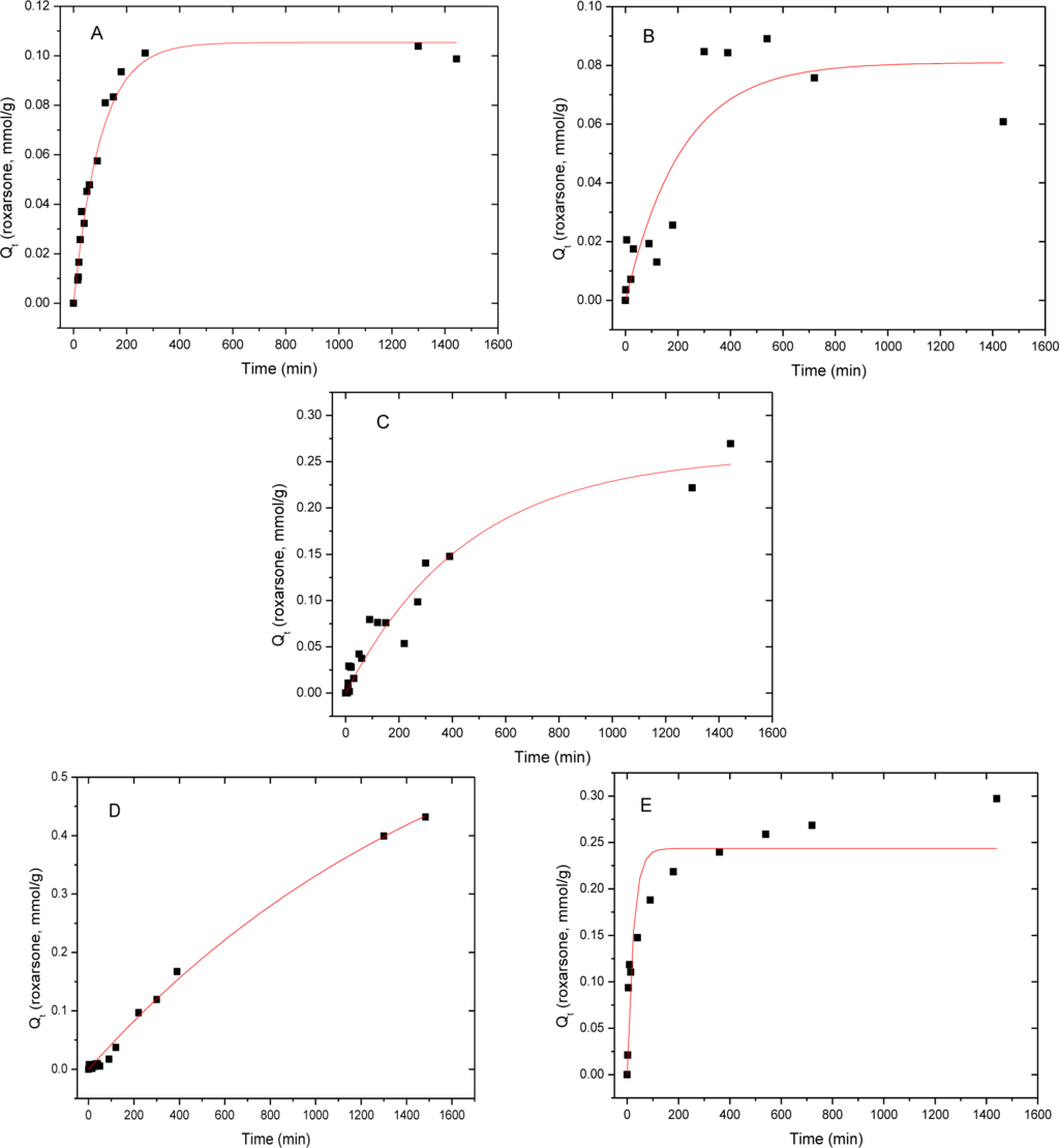 To obtain the rate constant, PFO model was used because root mean square error (RMSE) of the PFO model was better than that of PSO model (cf. Table 3), with the exception of goethite. Goethite showed better agreement with the PSO model; however, the values of Qe (mmol/g) were similar for the PFO and PSO models, as shown in Table 2.