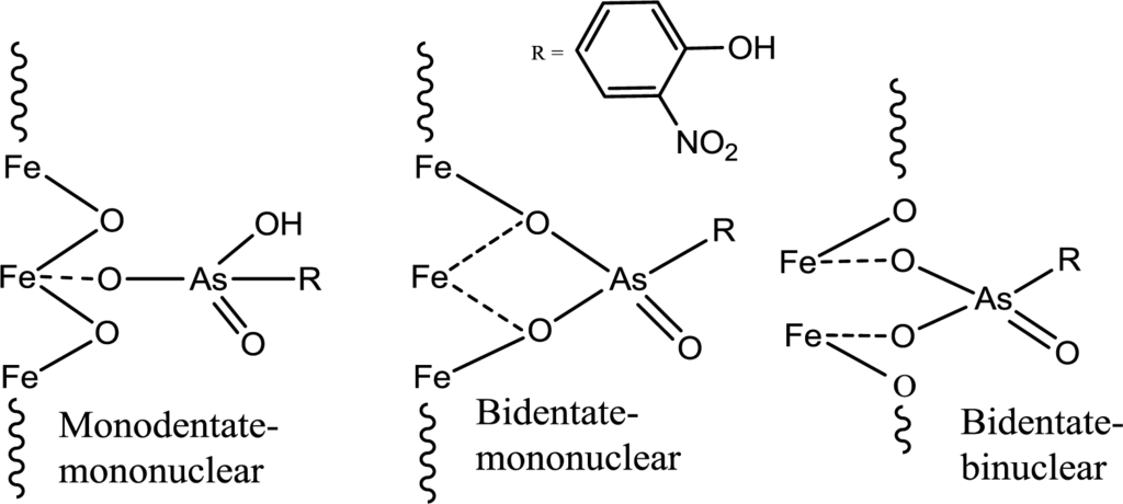 Various adsorbent materials have been used for uptake of organo-arsenicals [As (V); mg/g] such as roxarsone from other independent studies, and these results are summarized in Table 4 on the basis of As (V) content. In the case of secondary binding between the arsenate anion moiety of roxarsone and the iron oxide sites of the adsorbent, adsorption is thermodynamically favored as a bidentate-binuclear inner-sphere surface complex on the surfaces of magnetite composites [43] and goethite. As discussed in Section 2.1, the sorptive interaction of roxarsone with various adsorbents was attributed to EDA, surface complexation, and H-bonding. Considering the ionic potentials of the buffering agent and the adsorbate, uptake is favoured with roxarsone, not dihydrogen phosphate. Moreover, the measurement of absorbance of roxarsone was done at specific time intervals and the qe (mmol/g) parameter is the same regardless of the adsorbent even if dihydrogen phosphate was the major adsorbate species of interest.