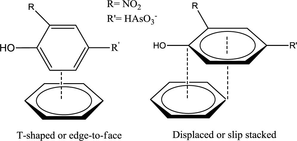 The monodentate-mononuclear inner-sphere surface complex is regarded as the minor contributor by recalling the anion speciation at the pH conditions employed herein, as illustrated in Figure 5. The adsorption mechanism for the arsenate moiety of roxarsone is proposed in Scheme 1, and is anticipated to be more important for inorganic forms of arsenic or its composite materials with greater loading of iron oxide on the graphene surface. In the case of magnetite materials, roxarsone is adsorbed as an outer-sphere surface complex due to the electrostatic repulsion between magnetite and roxarsone. H-bonding may occur between the surface hydroxyl groups of magnetite with the roxarsone anion or bound water which offsets electrostatic repulsive interactions. In the case of GAC, π-π displaced or T-shaped stacking interactions between the phenyl group of roxarsone and the graphene surface are the dominant interactions (cf. Scheme 2) [38]. Additional H-bonding and inner-sphere surface complexation may occur; however, the pheny ring interactions are considered as the main driving force for the uptake of roxarsone by GAC and its composite materials, in agreement with the hydrophobic effect. Considering the adsorptive rate constant values (kobs) in Table 2, the bidentate-binuclear inner-sphere surface complex with goethite may display a greater degree of ligand exchange; whereas, magnetite composites and GAC may undergo slower ligand exchange through π-π interactions affording enhanced sorptive interactions. Mag-P and Mag-C may be exposed to the slow inner-sphere surface complex formation rate and H-bonding where steric effects due to hydration processes attenuate the value of kobs. When the roxarsone anion is adsorbed onto the surface of iron oxide/oxyhydrate, a modified triple-layer model (TLM) may provide an understanding of the secondary importance of such surface complexation processes [46]. In this model, the adsorbed anion may be bound to the α-layer (equivalent to the inner Helmholtz plane), forming an inner-sphere complex, and the β-layer (equivalent to the outer Helmholtz plane), forms an outer-sphere surface complex [46].