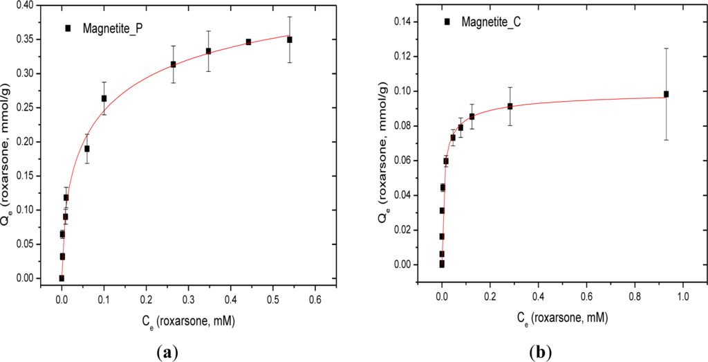 The sorptive uptake results at isotherm conditions for roxarsone with synthetic magnetite (Mag-P), commercial magnetite (Mag-C), GAC-magnetite composites with variable magnetite (32%, 19%, and 10%; w/w%) content, and goethite are shown in Figure 4 and Table 1. The maximum monolayer adsorption capacity of roxarsone (Qm = 1.783 mmol/g) was achieved with GAC. Although GAC contains a relatively low intrinsic level of Fe content [17] as an impurity due to its synthetic preparation, the sorptive removal of roxarsone is attributed primarily to noncovalent interactions such π-π stacking and H-bonding between the phenyl ring of roxarsone and the graphene surface of GAC. In the case of composite materials (CM-10, -19, and -32), the Qm value of roxarsone increased as the content of the activated carbon content increased, as anticipated for adsorptive processes influenced by the hydrophobic effect. By contrast, the iron oxide components such as magnetite, goethite, and magnetite composites which possess π-electron acceptor (Lewis acid) sites due to the presence of iron species on the adsorbent surface, especially for inorganic arsenate [12,21–23]. As well, favourable Lewis acid-based interactions may contribute to the formation of coordination complexes on the iron oxide surface because complexes between Fe species and the oxygen atoms of the roxarsone anion [25,26]. Adsorption of roxarsone on the heterogeneous surface sites of magnetite composites (CM-10 and CM-19) are supported by the exponent term (n > 1) from the Sips isotherm modeling parameters. Mag-C showed Langmuir adsorption (n = 1) because of its relatively uniform and homogeneous surface.