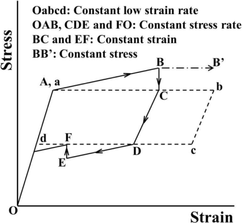 In Figure 10, the stress-strain diagram in the SE subloop loading: (1) under a low strain rate is shown by a broken line and (2) by a solid line for the stress relaxation and stress recovery under constant stress rate followed by holding the strain constant and thereafter unloading under a constant stress rate followed by holding the strain constant. The stress-temperature paths for stress relaxation and stress recovery in the stress-controlled subloop loading are shown on the stress-temperature phase diagram in Figure 11. The symbols A, B, C, D, E and F in Figure 10 correspond to those in Figure 11, respectively.